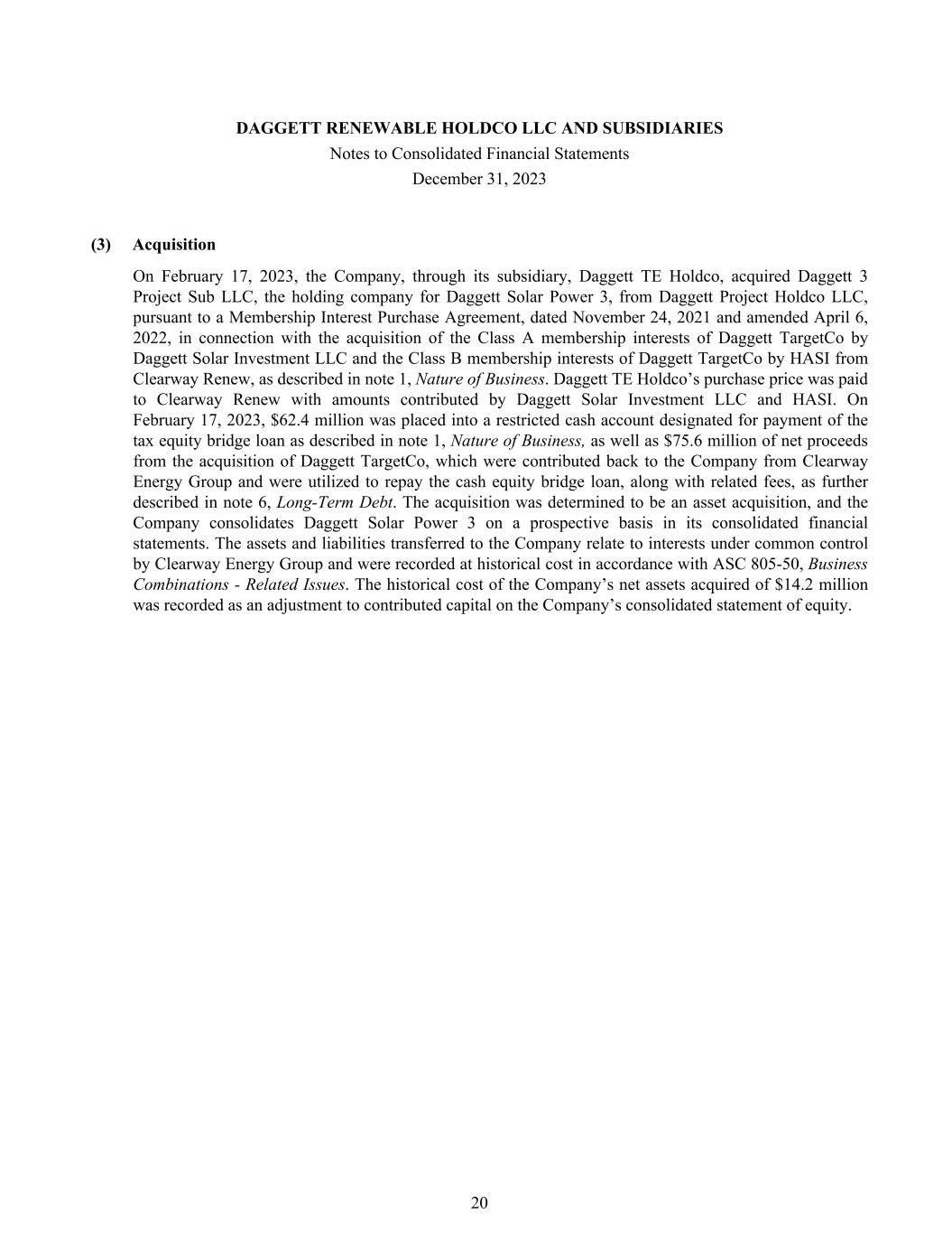 (3) Acquisition On February 17, 2023, the Company, through its subsidiary, Daggett TE Holdco, acquired Daggett 3 Project Sub LLC, the holding company for Daggett Solar Power 3, from Daggett Project Holdco LLC, pursuant to a Membership Interest Purchase Agreement, dated November 24, 2021 and amended April 6, 2022, in connection with the acquisition of the Class A membership interests of Daggett TargetCo by Daggett Solar Investment LLC and the Class B membership interests of Daggett TargetCo by HASI from Clearway Renew, as described in note 1, Nature of Business. Daggett TE Holdco’s purchase price was paid to Clearway Renew with amounts contributed by Daggett Solar Investment LLC and HASI. On February 17, 2023, $62.4 million was placed into a restricted cash account designated for payment of the tax equity bridge loan as described in note 1, Nature of Business, as well as $75.6 million of net proceeds from the acquisition of Daggett TargetCo, which were contributed back to the Company from Clearway Energy Group and were utilized to repay the cash equity bridge loan, along with related fees, as further described in note 6, Long-Term Debt. The acquisition was determined to be an asset acquisition, and the Company consolidates Daggett Solar Power 3 on a prospective basis in its consolidated financial statements. The assets and liabilities transferred to the Company relate to interests under common control by Clearway Energy Group and were recorded at historical cost in accordance with ASC 805-50, Business Combinations - Related Issues. The historical cost of the Company’s net assets acquired of $14.2 million was recorded as an adjustment to contributed capital on the Company’s consolidated statement of equity. DAGGETT RENEWABLE HOLDCO LLC AND SUBSIDIARIES Notes to Consolidated Financial Statements December 31, 2023 20