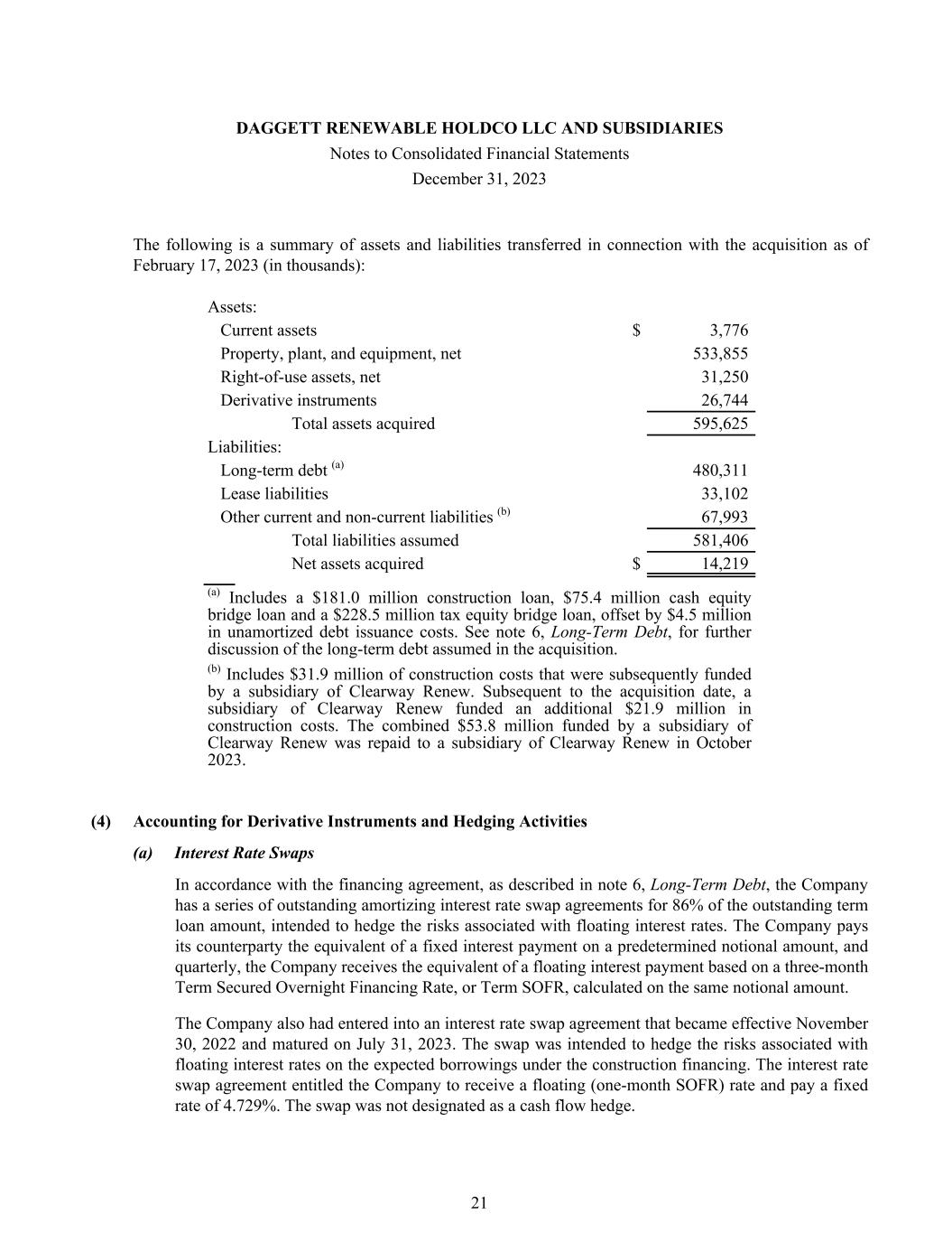 The following is a summary of assets and liabilities transferred in connection with the acquisition as of February 17, 2023 (in thousands): Assets: Current assets $ 3,776 Property, plant, and equipment, net 533,855 Right-of-use assets, net 31,250 Derivative instruments 26,744 Total assets acquired 595,625 Liabilities: Long-term debt (a) 480,311 Lease liabilities 33,102 Other current and non-current liabilities (b) 67,993 Total liabilities assumed 581,406 Net assets acquired $ 14,219 (a) Includes a $181.0 million construction loan, $75.4 million cash equity bridge loan and a $228.5 million tax equity bridge loan, offset by $4.5 million in unamortized debt issuance costs. See note 6, Long-Term Debt, for further discussion of the long-term debt assumed in the acquisition. (b) Includes $31.9 million of construction costs that were subsequently funded by a subsidiary of Clearway Renew. Subsequent to the acquisition date, a subsidiary of Clearway Renew funded an additional $21.9 million in construction costs. The combined $53.8 million funded by a subsidiary of Clearway Renew was repaid to a subsidiary of Clearway Renew in October 2023. (4) Accounting for Derivative Instruments and Hedging Activities (a) Interest Rate Swaps In accordance with the financing agreement, as described in note 6, Long-Term Debt, the Company has a series of outstanding amortizing interest rate swap agreements for 86% of the outstanding term loan amount, intended to hedge the risks associated with floating interest rates. The Company pays its counterparty the equivalent of a fixed interest payment on a predetermined notional amount, and quarterly, the Company receives the equivalent of a floating interest payment based on a three-month Term Secured Overnight Financing Rate, or Term SOFR, calculated on the same notional amount. The Company also had entered into an interest rate swap agreement that became effective November 30, 2022 and matured on July 31, 2023. The swap was intended to hedge the risks associated with floating interest rates on the expected borrowings under the construction financing. The interest rate swap agreement entitled the Company to receive a floating (one-month SOFR) rate and pay a fixed rate of 4.729%. The swap was not designated as a cash flow hedge. DAGGETT RENEWABLE HOLDCO LLC AND SUBSIDIARIES Notes to Consolidated Financial Statements December 31, 2023 21