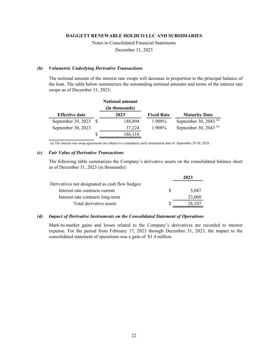 (b) Volumetric Underlying Derivative Transactions The notional amount of the interest rate swaps will decrease in proportion to the principal balance of the loan. The table below summarizes the outstanding notional amounts and terms of the interest rate swaps as of December 31, 2023: Notional amount (in thousands) Effective date 2023 Fixed Rate Maturity Date September 29, 2023 $ 148,894 1.908% September 30, 2043 (a) September 30, 2023 37,224 1.908% September 30, 2043 (a) $ 186,118 (a) The interest rate swap agreements are subject to a mandatory early termination date of September 29-30, 2028. (c) Fair Value of Derivative Transactions The following table summarizes the Company’s derivative assets on the consolidated balance sheet as of December 31, 2023 (in thousands): 2023 Derivatives not designated as cash flow hedges: Interest rate contracts current $ 5,047 Interest rate contracts long-term 23,060 Total derivative assets $ 28,107 (d) Impact of Derivative Instruments on the Consolidated Statement of Operations Mark-to-market gains and losses related to the Company’s derivatives are recorded to interest expense. For the period from February 17, 2023 through December 31, 2023, the impact to the consolidated statement of operations was a gain of $1.4 million. DAGGETT RENEWABLE HOLDCO LLC AND SUBSIDIARIES Notes to Consolidated Financial Statements December 31, 2023 22