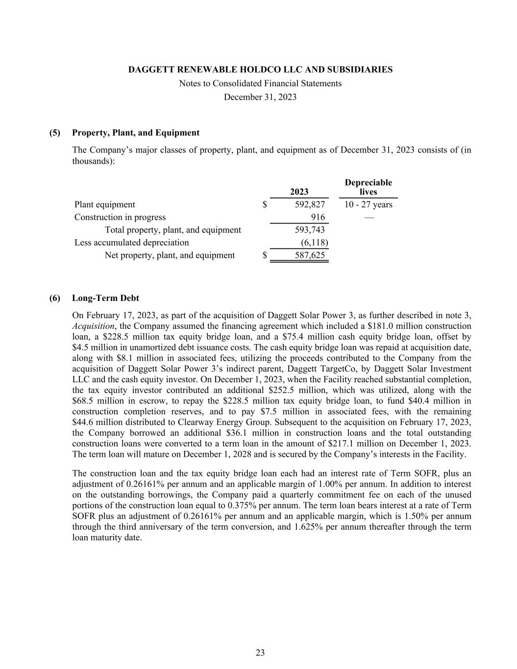 (5) Property, Plant, and Equipment The Company’s major classes of property, plant, and equipment as of December 31, 2023 consists of (in thousands): 2023 Depreciable lives Plant equipment $ 592,827 10 - 27 years Construction in progress 916 — Total property, plant, and equipment 593,743 Less accumulated depreciation (6,118) Net property, plant, and equipment $ 587,625 (6) Long-Term Debt On February 17, 2023, as part of the acquisition of Daggett Solar Power 3, as further described in note 3, Acquisition, the Company assumed the financing agreement which included a $181.0 million construction loan, a $228.5 million tax equity bridge loan, and a $75.4 million cash equity bridge loan, offset by $4.5 million in unamortized debt issuance costs. The cash equity bridge loan was repaid at acquisition date, along with $8.1 million in associated fees, utilizing the proceeds contributed to the Company from the acquisition of Daggett Solar Power 3’s indirect parent, Daggett TargetCo, by Daggett Solar Investment LLC and the cash equity investor. On December 1, 2023, when the Facility reached substantial completion, the tax equity investor contributed an additional $252.5 million, which was utilized, along with the $68.5 million in escrow, to repay the $228.5 million tax equity bridge loan, to fund $40.4 million in construction completion reserves, and to pay $7.5 million in associated fees, with the remaining $44.6 million distributed to Clearway Energy Group. Subsequent to the acquisition on February 17, 2023, the Company borrowed an additional $36.1 million in construction loans and the total outstanding construction loans were converted to a term loan in the amount of $217.1 million on December 1, 2023. The term loan will mature on December 1, 2028 and is secured by the Company’s interests in the Facility. The construction loan and the tax equity bridge loan each had an interest rate of Term SOFR, plus an adjustment of 0.26161% per annum and an applicable margin of 1.00% per annum. In addition to interest on the outstanding borrowings, the Company paid a quarterly commitment fee on each of the unused portions of the construction loan equal to 0.375% per annum. The term loan bears interest at a rate of Term SOFR plus an adjustment of 0.26161% per annum and an applicable margin, which is 1.50% per annum through the third anniversary of the term conversion, and 1.625% per annum thereafter through the term loan maturity date. DAGGETT RENEWABLE HOLDCO LLC AND SUBSIDIARIES Notes to Consolidated Financial Statements December 31, 2023 23