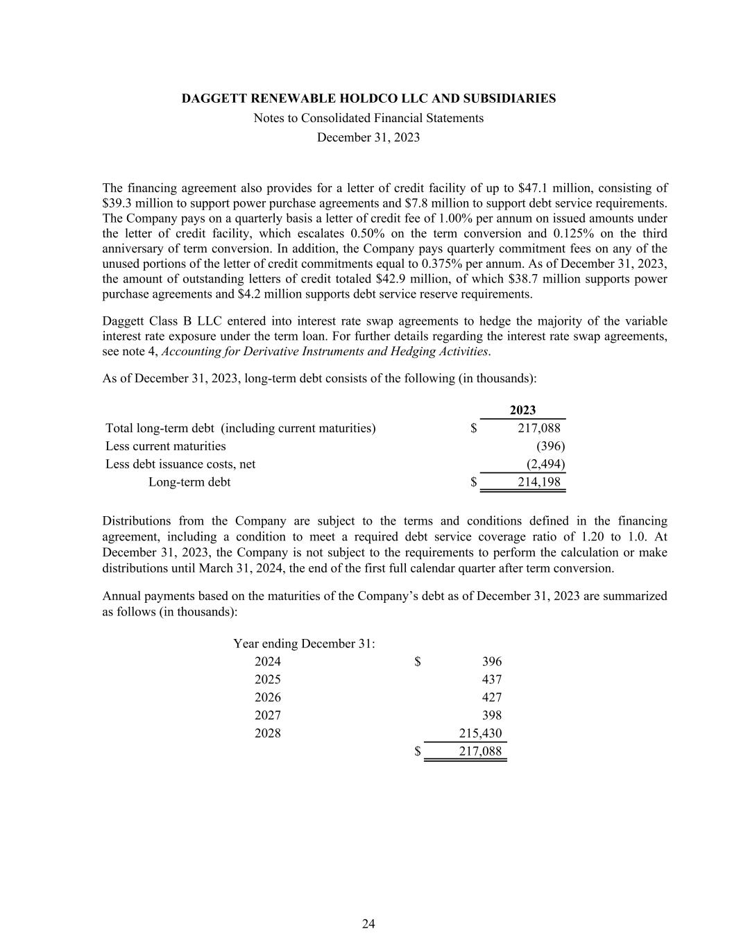 The financing agreement also provides for a letter of credit facility of up to $47.1 million, consisting of $39.3 million to support power purchase agreements and $7.8 million to support debt service requirements. The Company pays on a quarterly basis a letter of credit fee of 1.00% per annum on issued amounts under the letter of credit facility, which escalates 0.50% on the term conversion and 0.125% on the third anniversary of term conversion. In addition, the Company pays quarterly commitment fees on any of the unused portions of the letter of credit commitments equal to 0.375% per annum. As of December 31, 2023, the amount of outstanding letters of credit totaled $42.9 million, of which $38.7 million supports power purchase agreements and $4.2 million supports debt service reserve requirements. Daggett Class B LLC entered into interest rate swap agreements to hedge the majority of the variable interest rate exposure under the term loan. For further details regarding the interest rate swap agreements, see note 4, Accounting for Derivative Instruments and Hedging Activities. As of December 31, 2023, long-term debt consists of the following (in thousands): 2023 Total long-term debt (including current maturities) $ 217,088 Less current maturities (396) Less debt issuance costs, net (2,494) Long-term debt $ 214,198 Distributions from the Company are subject to the terms and conditions defined in the financing agreement, including a condition to meet a required debt service coverage ratio of 1.20 to 1.0. At December 31, 2023, the Company is not subject to the requirements to perform the calculation or make distributions until March 31, 2024, the end of the first full calendar quarter after term conversion. Annual payments based on the maturities of the Company’s debt as of December 31, 2023 are summarized as follows (in thousands): Year ending December 31: 2024 $ 396 2025 437 2026 427 2027 398 2028 215,430 $ 217,088 DAGGETT RENEWABLE HOLDCO LLC AND SUBSIDIARIES Notes to Consolidated Financial Statements December 31, 2023 24