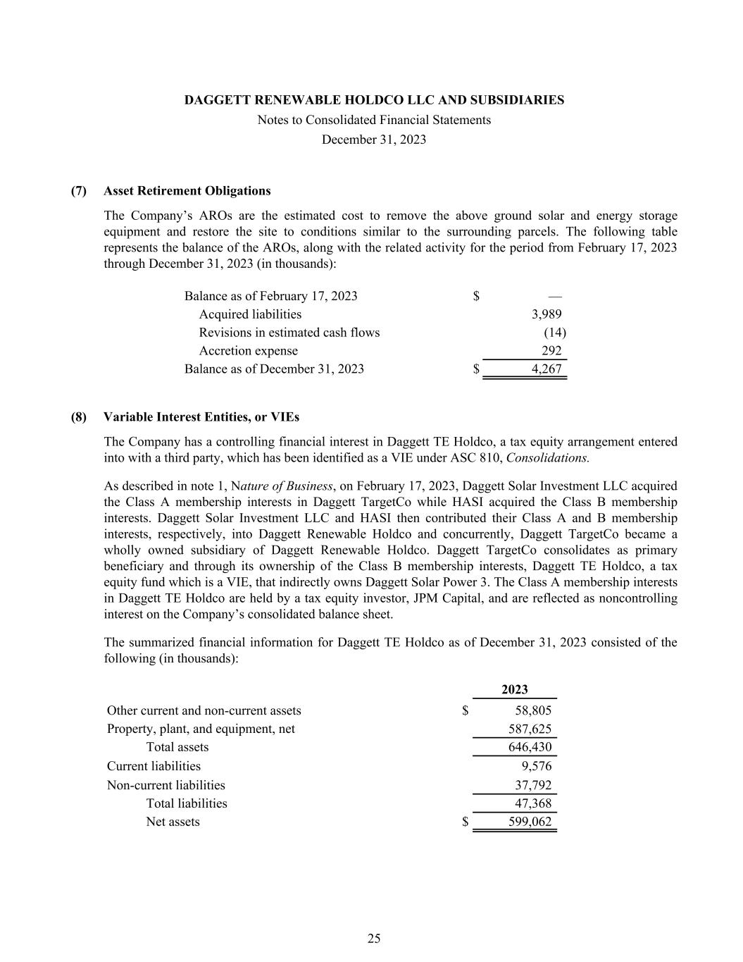 (7) Asset Retirement Obligations The Company’s AROs are the estimated cost to remove the above ground solar and energy storage equipment and restore the site to conditions similar to the surrounding parcels. The following table represents the balance of the AROs, along with the related activity for the period from February 17, 2023 through December 31, 2023 (in thousands): Balance as of February 17, 2023 $ — Acquired liabilities 3,989 Revisions in estimated cash flows (14) Accretion expense 292 Balance as of December 31, 2023 $ 4,267 (8) Variable Interest Entities, or VIEs The Company has a controlling financial interest in Daggett TE Holdco, a tax equity arrangement entered into with a third party, which has been identified as a VIE under ASC 810, Consolidations. As described in note 1, Nature of Business, on February 17, 2023, Daggett Solar Investment LLC acquired the Class A membership interests in Daggett TargetCo while HASI acquired the Class B membership interests. Daggett Solar Investment LLC and HASI then contributed their Class A and B membership interests, respectively, into Daggett Renewable Holdco and concurrently, Daggett TargetCo became a wholly owned subsidiary of Daggett Renewable Holdco. Daggett TargetCo consolidates as primary beneficiary and through its ownership of the Class B membership interests, Daggett TE Holdco, a tax equity fund which is a VIE, that indirectly owns Daggett Solar Power 3. The Class A membership interests in Daggett TE Holdco are held by a tax equity investor, JPM Capital, and are reflected as noncontrolling interest on the Company’s consolidated balance sheet. The summarized financial information for Daggett TE Holdco as of December 31, 2023 consisted of the following (in thousands): 2023 Other current and non-current assets $ 58,805 Property, plant, and equipment, net 587,625 Total assets 646,430 Current liabilities 9,576 Non-current liabilities 37,792 Total liabilities 47,368 Net assets $ 599,062 DAGGETT RENEWABLE HOLDCO LLC AND SUBSIDIARIES Notes to Consolidated Financial Statements December 31, 2023 25