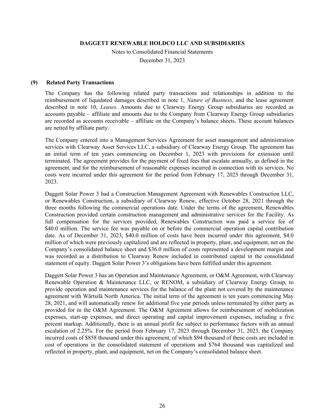 (9) Related Party Transactions The Company has the following related party transactions and relationships in addition to the reimbursement of liquidated damages described in note 1, Nature of Business, and the lease agreement described in note 10, Leases. Amounts due to Clearway Energy Group subsidiaries are recorded as accounts payable – affiliate and amounts due to the Company from Clearway Energy Group subsidiaries are recorded as accounts receivable – affiliate on the Company’s balance sheets. These account balances are netted by affiliate party. The Company entered into a Management Services Agreement for asset management and administration services with Clearway Asset Services LLC, a subsidiary of Clearway Energy Group. The agreement has an initial term of ten years commencing on December 1, 2023 with provisions for extension until terminated. The agreement provides for the payment of fixed fees that escalate annually, as defined in the agreement, and for the reimbursement of reasonable expenses incurred in connection with its services. No costs were incurred under this agreement for the period from February 17, 2023 through December 31, 2023. Daggett Solar Power 3 had a Construction Management Agreement with Renewables Construction LLC, or Renewables Construction, a subsidiary of Clearway Renew, effective October 28, 2021 through the three months following the commercial operations date. Under the terms of the agreement, Renewables Construction provided certain construction management and administrative services for the Facility. As full compensation for the services provided, Renewables Construction was paid a service fee of $40.0 million. The service fee was payable on or before the commercial operation capital contribution date. As of December 31, 2023, $40.0 million of costs have been incurred under this agreement, $4.0 million of which were previously capitalized and are reflected in property, plant, and equipment, net on the Company’s consolidated balance sheet and $36.0 million of costs represented a development margin and was recorded as a distribution to Clearway Renew included in contributed capital in the consolidated statement of equity. Daggett Solar Power 3’s obligations have been fulfilled under this agreement. Daggett Solar Power 3 has an Operation and Maintenance Agreement, or O&M Agreement, with Clearway Renewable Operation & Maintenance LLC, or RENOM, a subsidiary of Clearway Energy Group, to provide operation and maintenance services for the balance of the plant not covered by the maintenance agreement with Wärtsilä North America. The initial term of the agreement is ten years commencing May 28, 2021, and will automatically renew for additional five year periods unless terminated by either party as provided for in the O&M Agreement. The O&M Agreement allows for reimbursement of mobilization expenses, start-up expenses, and direct operating and capital improvement expenses, including a five percent markup. Additionally, there is an annual profit fee subject to performance factors with an annual escalation of 2.25%. For the period from February 17, 2023 through December 31, 2023, the Company incurred costs of $858 thousand under this agreement, of which $94 thousand of these costs are included in cost of operations in the consolidated statement of operations and $764 thousand was capitalized and reflected in property, plant, and equipment, net on the Company’s consolidated balance sheet. DAGGETT RENEWABLE HOLDCO LLC AND SUBSIDIARIES Notes to Consolidated Financial Statements December 31, 2023 26