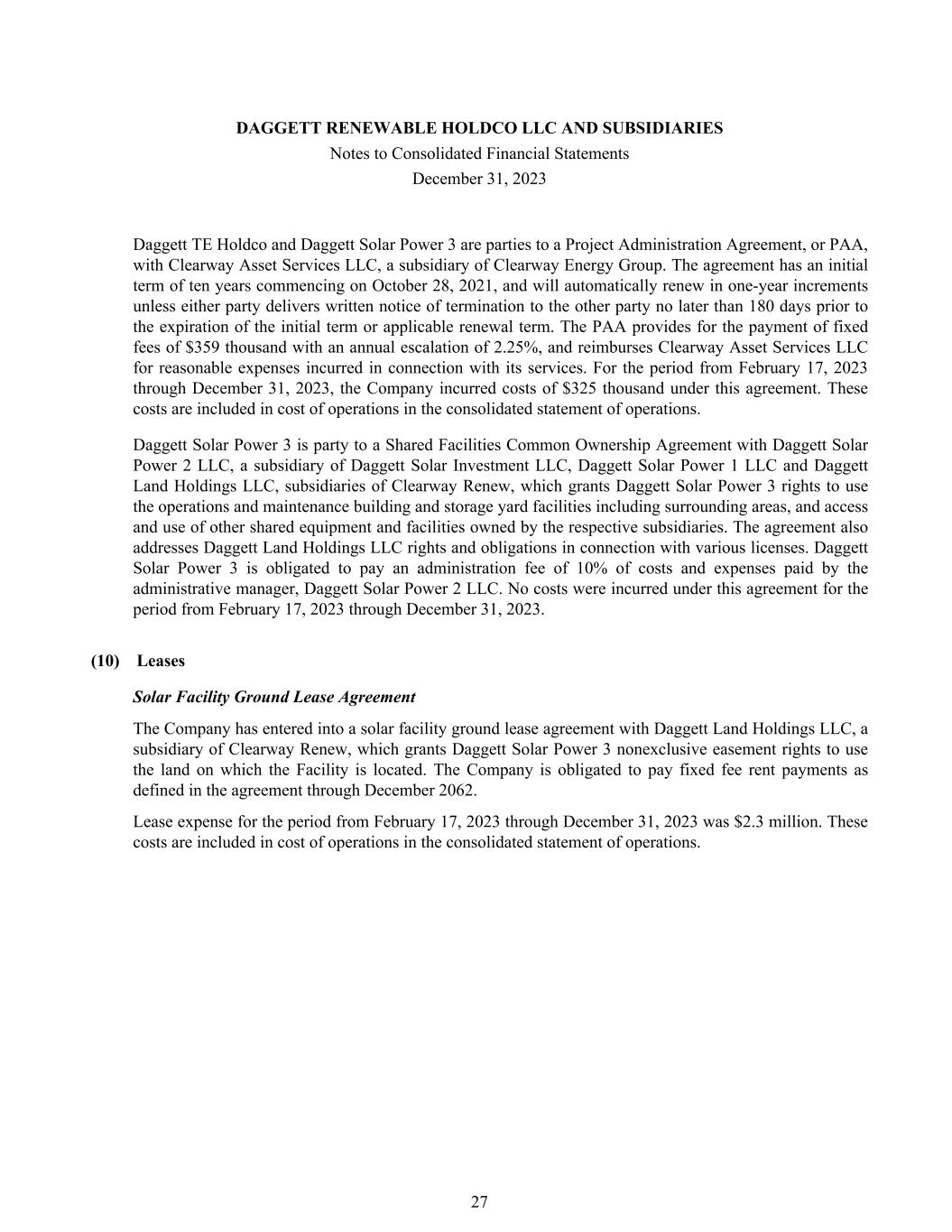 Daggett TE Holdco and Daggett Solar Power 3 are parties to a Project Administration Agreement, or PAA, with Clearway Asset Services LLC, a subsidiary of Clearway Energy Group. The agreement has an initial term of ten years commencing on October 28, 2021, and will automatically renew in one-year increments unless either party delivers written notice of termination to the other party no later than 180 days prior to the expiration of the initial term or applicable renewal term. The PAA provides for the payment of fixed fees of $359 thousand with an annual escalation of 2.25%, and reimburses Clearway Asset Services LLC for reasonable expenses incurred in connection with its services. For the period from February 17, 2023 through December 31, 2023, the Company incurred costs of $325 thousand under this agreement. These costs are included in cost of operations in the consolidated statement of operations. Daggett Solar Power 3 is party to a Shared Facilities Common Ownership Agreement with Daggett Solar Power 2 LLC, a subsidiary of Daggett Solar Investment LLC, Daggett Solar Power 1 LLC and Daggett Land Holdings LLC, subsidiaries of Clearway Renew, which grants Daggett Solar Power 3 rights to use the operations and maintenance building and storage yard facilities including surrounding areas, and access and use of other shared equipment and facilities owned by the respective subsidiaries. The agreement also addresses Daggett Land Holdings LLC rights and obligations in connection with various licenses. Daggett Solar Power 3 is obligated to pay an administration fee of 10% of costs and expenses paid by the administrative manager, Daggett Solar Power 2 LLC. No costs were incurred under this agreement for the period from February 17, 2023 through December 31, 2023. (10) Leases Solar Facility Ground Lease Agreement The Company has entered into a solar facility ground lease agreement with Daggett Land Holdings LLC, a subsidiary of Clearway Renew, which grants Daggett Solar Power 3 nonexclusive easement rights to use the land on which the Facility is located. The Company is obligated to pay fixed fee rent payments as defined in the agreement through December 2062. Lease expense for the period from February 17, 2023 through December 31, 2023 was $2.3 million. These costs are included in cost of operations in the consolidated statement of operations. DAGGETT RENEWABLE HOLDCO LLC AND SUBSIDIARIES Notes to Consolidated Financial Statements December 31, 2023 27