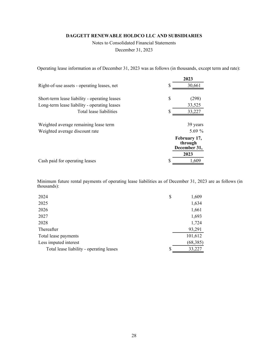Operating lease information as of December 31, 2023 was as follows (in thousands, except term and rate): 2023 Right-of-use assets - operating leases, net $ 30,661 Short-term lease liability - operating leases $ (298) Long-term lease liability - operating leases 33,525 Total lease liabilities $ 33,227 Weighted average remaining lease term 39 years Weighted average discount rate 5.69 % February 17, through December 31, 2023 Cash paid for operating leases $ 1,609 Minimum future rental payments of operating lease liabilities as of December 31, 2023 are as follows (in thousands): 2024 $ 1,609 2025 1,634 2026 1,661 2027 1,693 2028 1,724 Thereafter 93,291 Total lease payments 101,612 Less imputed interest (68,385) Total lease liability - operating leases $ 33,227 DAGGETT RENEWABLE HOLDCO LLC AND SUBSIDIARIES Notes to Consolidated Financial Statements December 31, 2023 28