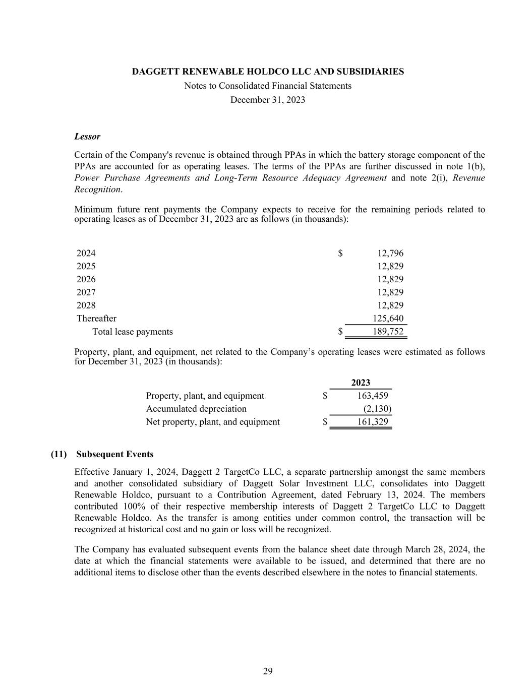 Lessor Certain of the Company's revenue is obtained through PPAs in which the battery storage component of the PPAs are accounted for as operating leases. The terms of the PPAs are further discussed in note 1(b), Power Purchase Agreements and Long-Term Resource Adequacy Agreement and note 2(i), Revenue Recognition. Minimum future rent payments the Company expects to receive for the remaining periods related to operating leases as of December 31, 2023 are as follows (in thousands): 2024 $ 12,796 2025 12,829 2026 12,829 2027 12,829 2028 12,829 Thereafter 125,640 Total lease payments $ 189,752 Property, plant, and equipment, net related to the Company’s operating leases were estimated as follows for December 31, 2023 (in thousands): 2023 Property, plant, and equipment $ 163,459 Accumulated depreciation (2,130) Net property, plant, and equipment $ 161,329 (11) Subsequent Events Effective January 1, 2024, Daggett 2 TargetCo LLC, a separate partnership amongst the same members and another consolidated subsidiary of Daggett Solar Investment LLC, consolidates into Daggett Renewable Holdco, pursuant to a Contribution Agreement, dated February 13, 2024. The members contributed 100% of their respective membership interests of Daggett 2 TargetCo LLC to Daggett Renewable Holdco. As the transfer is among entities under common control, the transaction will be recognized at historical cost and no gain or loss will be recognized. The Company has evaluated subsequent events from the balance sheet date through March 28, 2024, the date at which the financial statements were available to be issued, and determined that there are no additional items to disclose other than the events described elsewhere in the notes to financial statements. DAGGETT RENEWABLE HOLDCO LLC AND SUBSIDIARIES Notes to Consolidated Financial Statements December 31, 2023 29