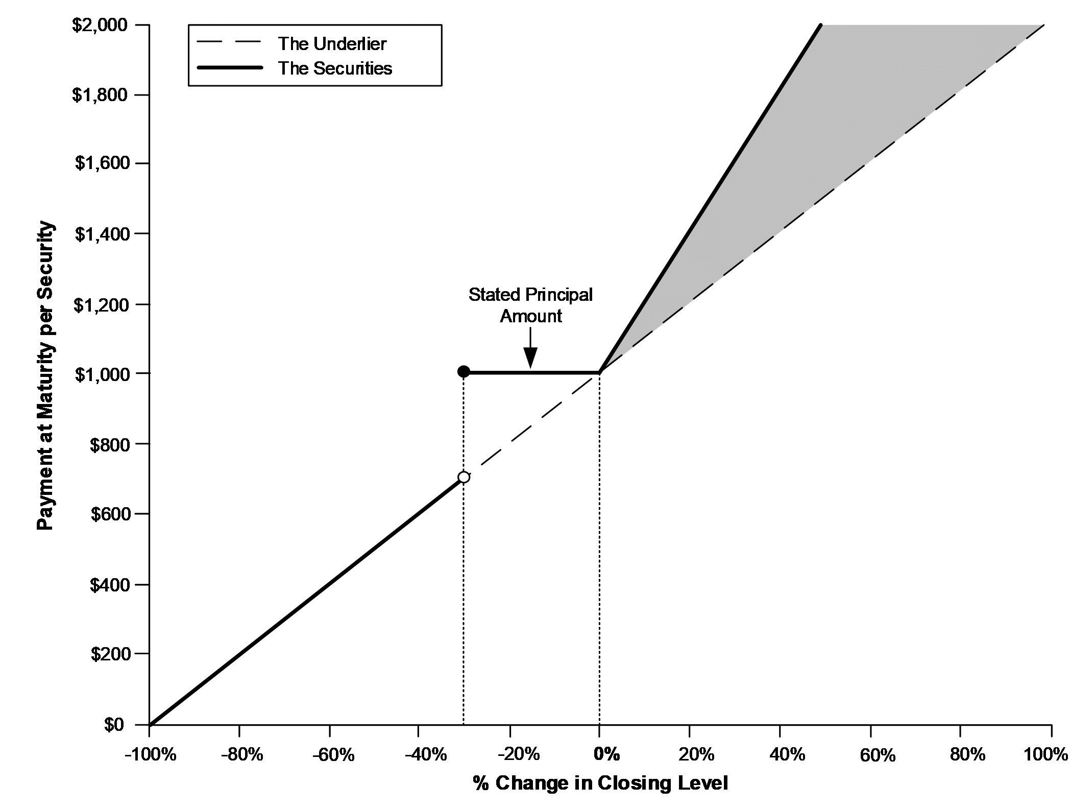 ■Payment at maturity. At maturity, if the final level is greater than the initial level, investors will receive the stated principal amount plus the leveraged upside payment. If the final level is equal to or less than the initial level but is greater than or equal to the downside threshold level, investors will receive only the stated principal amount at maturity. If, however, the final level is less than the downside threshold level, investors will lose 1% for every 1% decline in the level of the underlier over the term of the securities. Under these circumstances, the payment at maturity will be significantly less than the stated principal amount and could be zero.
