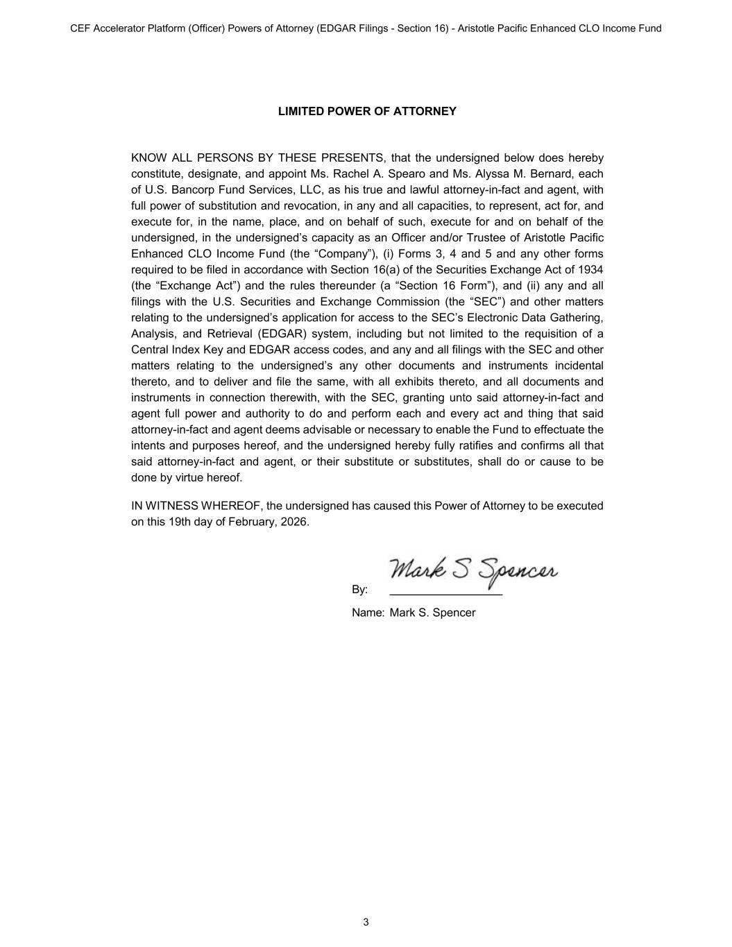 LIMITED POWER OF ATTORNEY KNOW ALL PERSONS BY THESE PRESENTS, that the undersigned below does hereby constitute, designate, and appoint Ms. Rachel A. Spearo and Ms. Alyssa M. Bernard, each of U.S. Bancorp Fund Services, LLC, as his true and lawful attorney-in-fact and agent, with full power of substitution and revocation, in any and all capacities, to represent, act for, and execute for, in the name, place, and on behalf of such, execute for and on behalf of the undersigned, in the undersigned’s capacity as an Officer and/or Trustee of Aristotle Pacific Enhanced CLO Income Fund (the “Company”), (i) Forms 3, 4 and 5 and any other forms required to be filed in accordance with Section 16(a) of the Securities Exchange Act of 1934 (the “Exchange Act”) and the rules thereunder (a “Section 16 Form”), and (ii) any and all filings with the U.S. Securities and Exchange Commission (the “SEC”) and other matters relating to the undersigned’s application for access to the SEC’s Electronic Data Gathering, Analysis, and Retrieval (EDGAR) system, including but not limited to the requisition of a Central Index Key and EDGAR access codes, and any and all filings with the SEC and other matters relating to the undersigned’s any other documents and instruments incidental thereto, and to deliver and file the same, with all exhibits thereto, and all documents and instruments in connection therewith, with the SEC, granting unto said attorney-in-fact and agent full power and authority to do and perform each and every act and thing that said attorney-in-fact and agent deems advisable or necessary to enable the Fund to effectuate the intents and purposes hereof, and the undersigned hereby fully ratifies and confirms all that said attorney-in-fact and agent, or their substitute or substitutes, shall do or cause to be done by virtue hereof. IN WITNESS WHEREOF, the undersigned has caused this Power of Attorney to be executed on this 19th day of February, 2026. By: Name: Mark S. Spencer CEF Accelerator Platform (Officer) Powers of Attorney (EDGAR Filings - Section 16) - Aristotle Pacific Enhanced CLO Income Fund 3