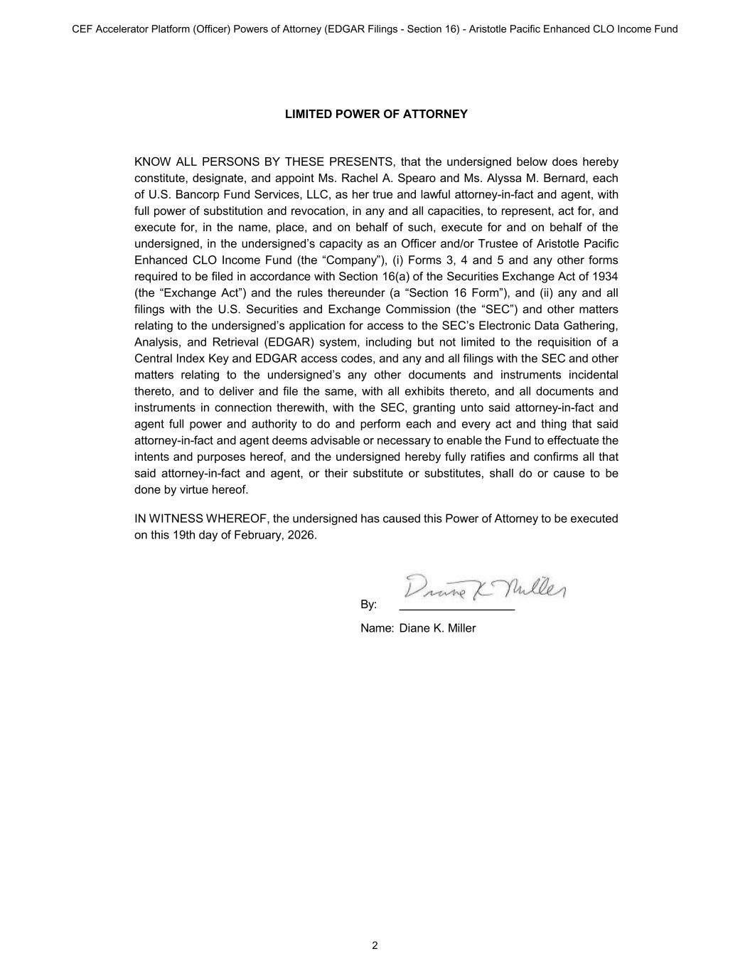 LIMITED POWER OF ATTORNEY KNOW ALL PERSONS BY THESE PRESENTS, that the undersigned below does hereby constitute, designate, and appoint Ms. Rachel A. Spearo and Ms. Alyssa M. Bernard, each of U.S. Bancorp Fund Services, LLC, as her true and lawful attorney-in-fact and agent, with full power of substitution and revocation, in any and all capacities, to represent, act for, and execute for, in the name, place, and on behalf of such, execute for and on behalf of the undersigned, in the undersigned’s capacity as an Officer and/or Trustee of Aristotle Pacific Enhanced CLO Income Fund (the “Company”), (i) Forms 3, 4 and 5 and any other forms required to be filed in accordance with Section 16(a) of the Securities Exchange Act of 1934 (the “Exchange Act”) and the rules thereunder (a “Section 16 Form”), and (ii) any and all filings with the U.S. Securities and Exchange Commission (the “SEC”) and other matters relating to the undersigned’s application for access to the SEC’s Electronic Data Gathering, Analysis, and Retrieval (EDGAR) system, including but not limited to the requisition of a Central Index Key and EDGAR access codes, and any and all filings with the SEC and other matters relating to the undersigned’s any other documents and instruments incidental thereto, and to deliver and file the same, with all exhibits thereto, and all documents and instruments in connection therewith, with the SEC, granting unto said attorney-in-fact and agent full power and authority to do and perform each and every act and thing that said attorney-in-fact and agent deems advisable or necessary to enable the Fund to effectuate the intents and purposes hereof, and the undersigned hereby fully ratifies and confirms all that said attorney-in-fact and agent, or their substitute or substitutes, shall do or cause to be done by virtue hereof. IN WITNESS WHEREOF, the undersigned has caused this Power of Attorney to be executed on this 19th day of February, 2026. By: Name: Diane K. Miller CEF Accelerator Platform (Officer) Powers of Attorney (EDGAR Filings - Section 16) - Aristotle Pacific Enhanced CLO Income Fund 2