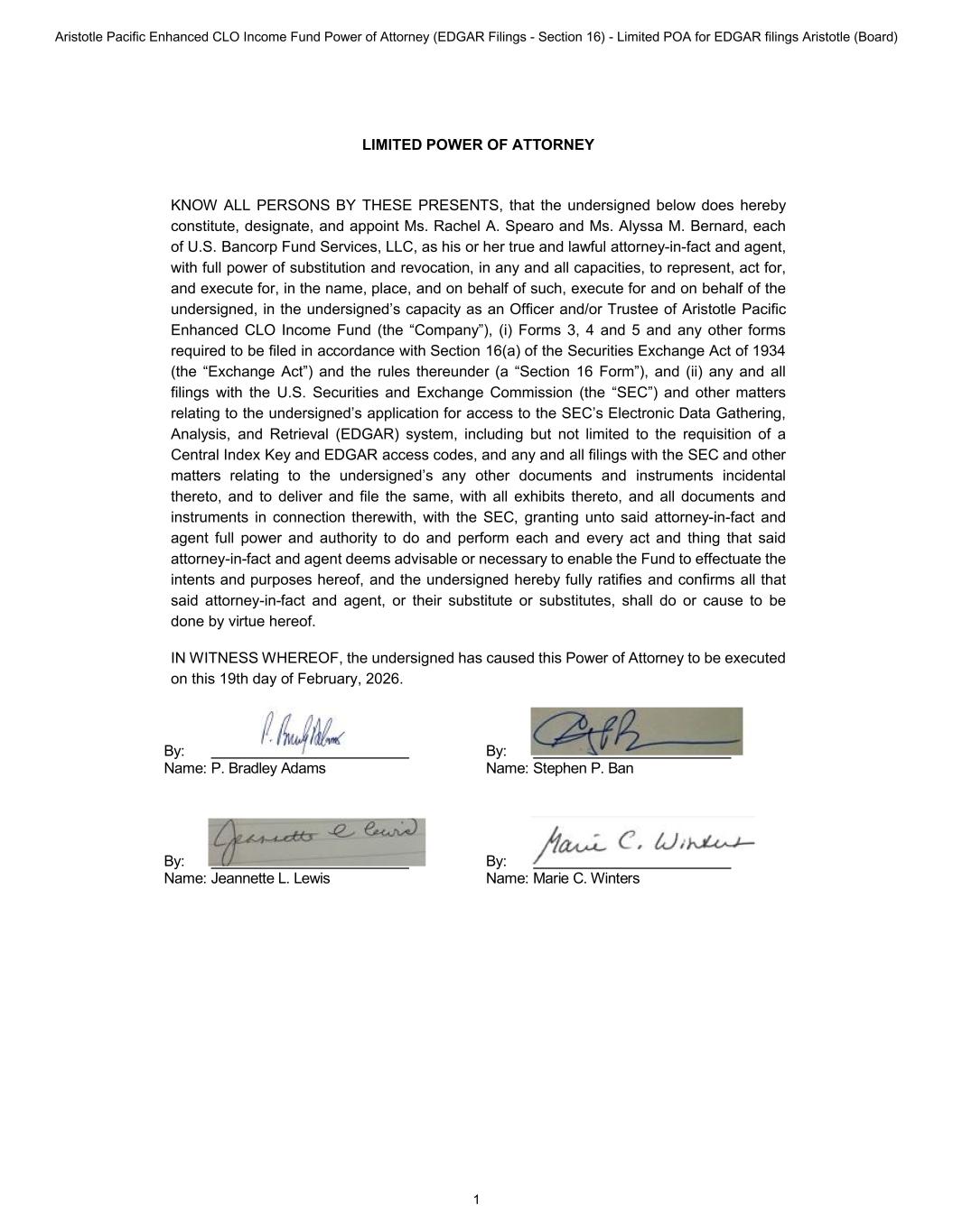 LIMITED POWER OF ATTORNEY KNOW ALL PERSONS BY THESE PRESENTS, that the undersigned below does hereby constitute, designate, and appoint Ms. Rachel A. Spearo and Ms. Alyssa M. Bernard, each of U.S. Bancorp Fund Services, LLC, as his or her true and lawful attorney-in-fact and agent, with full power of substitution and revocation, in any and all capacities, to represent, act for, and execute for, in the name, place, and on behalf of such, execute for and on behalf of the undersigned, in the undersigned’s capacity as an Officer and/or Trustee of Aristotle Pacific Enhanced CLO Income Fund (the “Company”), (i) Forms 3, 4 and 5 and any other forms required to be filed in accordance with Section 16(a) of the Securities Exchange Act of 1934 (the “Exchange Act”) and the rules thereunder (a “Section 16 Form”), and (ii) any and all filings with the U.S. Securities and Exchange Commission (the “SEC”) and other matters relating to the undersigned’s application for access to the SEC’s Electronic Data Gathering, Analysis, and Retrieval (EDGAR) system, including but not limited to the requisition of a Central Index Key and EDGAR access codes, and any and all filings with the SEC and other matters relating to the undersigned’s any other documents and instruments incidental thereto, and to deliver and file the same, with all exhibits thereto, and all documents and instruments in connection therewith, with the SEC, granting unto said attorney-in-fact and agent full power and authority to do and perform each and every act and thing that said attorney-in-fact and agent deems advisable or necessary to enable the Fund to effectuate the intents and purposes hereof, and the undersigned hereby fully ratifies and confirms all that said attorney-in-fact and agent, or their substitute or substitutes, shall do or cause to be done by virtue hereof. IN WITNESS WHEREOF, the undersigned has caused this Power of Attorney to be executed on this 19th day of February, 2026. By: Name: P. Bradley Adams By: Name: Stephen P. Ban By: Name: Jeannette L. Lewis By: Name: Marie C. Winters Aristotle Pacific Enhanced CLO Income Fund Power of Attorney (EDGAR Filings - Section 16) - Limited POA for EDGAR filings Aristotle (Board) 1