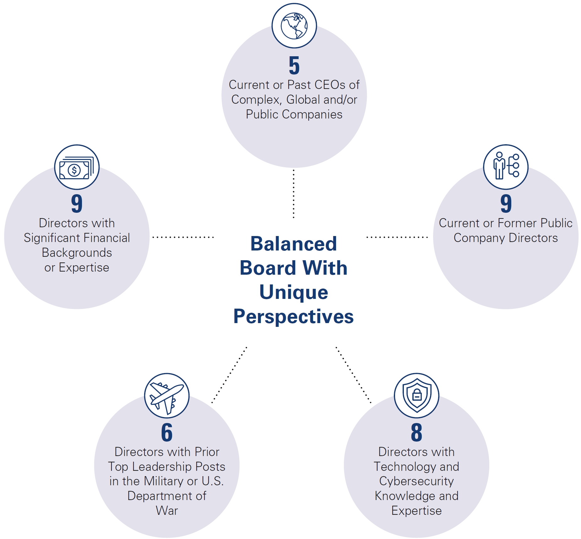 We have an experienced and seasoned board coming from industry, government and the military. Your board provides independent oversight and close management of key risks and opportunities faced by our company. Among other topics, the Board received briefings throughout the year on defense budget and acquisition matters, emerging technologies, including generative artificial intelligence, supply chain challenges and succession planning.