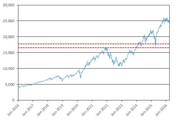 The graph below illustrates the performance of NDX from January 1, 2016 through March 26, 2026, based on the daily closing levels as reported by Bloomberg, without independent verification. UBS has not conducted any independent review or due diligence of any publicly available information obtained from Bloomberg. The closing level of NDX on March 26, 2026 was 23,586.99. The dotted lines represent its coupon barrier of 17,690.24, which is equal to 75.00% of its initial level, and its downside threshold of 16,510.89, which is equal to 70.00% of its initial level. Past performance of the underlying asset is not indicative of the future performance of the underlying asset during the term of the Notes.