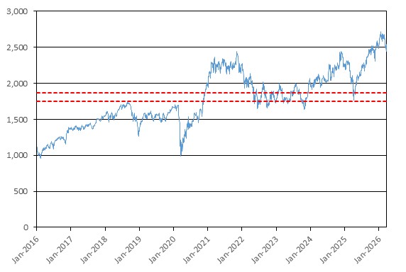 The graph below illustrates the performance of RTY from January 1, 2016 through March 26, 2026, based on the daily closing levels as reported by Bloomberg, without independent verification. UBS has not conducted any independent review or due diligence of any publicly available information obtained from Bloomberg. The closing level of RTY on March 26, 2026 was 2,493.321. The dotted lines represent its coupon barrier of 1,869.991, which is equal to 75.00% of its initial level, and its downside threshold of 1,745.325, which is equal to 70.00% of its initial level. Past performance of the underlying asset is not indicative of the future performance of the underlying asset during the term of the Notes.