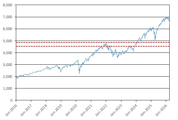 The graph below illustrates the performance of SPX from January 1, 2016 through March 26, 2026, based on the daily closing levels as reported by Bloomberg, without independent verification. UBS has not conducted any independent review or due diligence of any publicly available information obtained from Bloomberg. The closing level of SPX on March 26, 2026 was 6,477.16. The dotted lines represent its coupon barrier of 4,857.87, which is equal to 75.00% of its initial level, and its downside threshold of 4,534.01, which is equal to 70.00% of its initial level. Past performance of the underlying asset is not indicative of the future performance of the underlying asset during the term of the Notes.