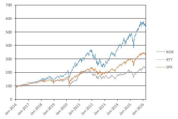 The graph below illustrates the daily performance of the underlying assets from January 1, 2016 through March 26, 2026. For comparison purposes, each underlying asset has been normalized to have a closing level of 100.00 on January 1, 2016 by dividing the closing level of that underlying asset on each trading day by the closing level of that underlying asset on January 1, 2016 and multiplying by 100.00. We obtained the closing levels used to determine the normalized closing levels set forth below from Bloomberg, without independent verification.