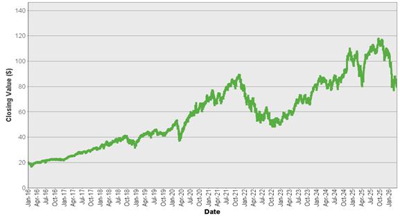 | State Street® SPDR® S&P® Regional Banking ETF – Historical Closing Values January 4, 2016 to March 26, 2026 |