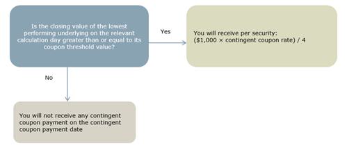 If the securities have not been previously automatically redeemed, on each contingent coupon payment date, you will either receive a contingent coupon payment or you will not receive a contingent coupon payment, depending on the closing value of the lowest performing underlying on the related calculation day.