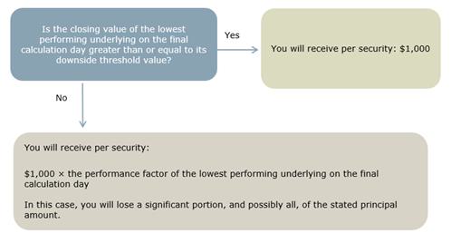 | · | understand that if the closing value of the lowest performing underlying on the final calculation day is less than its downside threshold value, they will be fully exposed to the decline in the lowest performing underlying from its starting value and will receive significantly less than the stated principal amount, and possibly nothing, at maturity; |