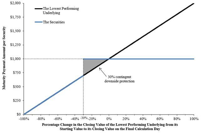 The following profile illustrates the potential maturity payment amount on the securities (excluding the final contingent coupon payment, if any) for a range of hypothetical performances of the lowest performing underlying on the final calculation day from its starting value to its closing value on the final calculation day, assuming the securities have not been automatically redeemed prior to the maturity date. This graph has been prepared for purposes of illustration only. Your actual return on the securities will depend on the actual closing value of the lowest performing underlying on the final calculation day and whether you hold your securities to the maturity date. The performance of any better performing underlying is not relevant to your return on the securities.