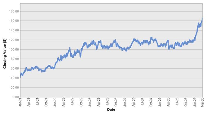 The graph below shows the closing value of Exxon Mobil Corporation for each day such value was available from January 4, 2021 to March 25, 2026. We obtained the closing values from Bloomberg L.P., without independent verification. If certain corporate transactions occurred during the historical period shown below, including, but not limited to, spin-offs or mergers, then the closing values shown below for the period prior to the occurrence of any such transaction have been adjusted by Bloomberg L.P. as if any such transaction had occurred prior to the first day in the period shown below. You should not take historical closing values as an indication of future performance.