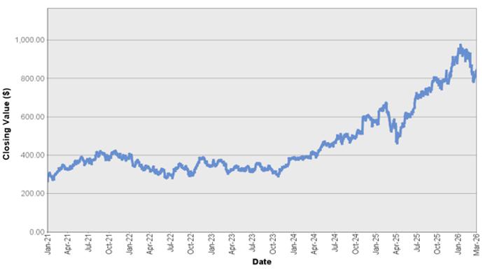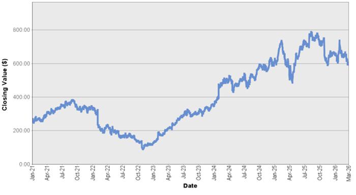 The graph below shows the closing value of The Goldman Sachs Group, Inc. for each day such value was available from January 4, 2021 to March 25, 2026. We obtained the closing values from Bloomberg L.P., without independent verification. If certain corporate transactions occurred during the historical period shown below, including, but not limited to, spin-offs or mergers, then the closing values shown below for the period prior to the occurrence of any such transaction have been adjusted by Bloomberg L.P. as if any such transaction had occurred prior to the first day in the period shown below. You should not take historical closing values as an indication of future performance.