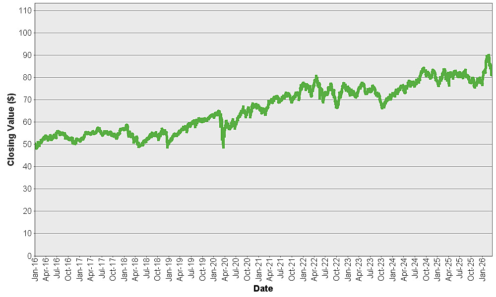 The graph below shows the closing value of the State Street® Consumer Staples Select Sector SPDR® ETF for each day such value was available from January 4, 2016 to March 26, 2026. We obtained the closing values from Bloomberg L.P., without independent verification. You should not take historical closing values as an indication of future performance.