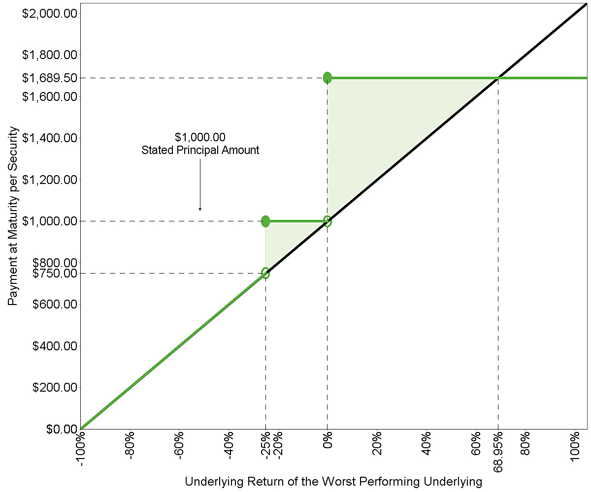 Payment at maturity per security = $1,000 + ($1,000 × the underlying return of the worst performing underlying on the final valuation date)