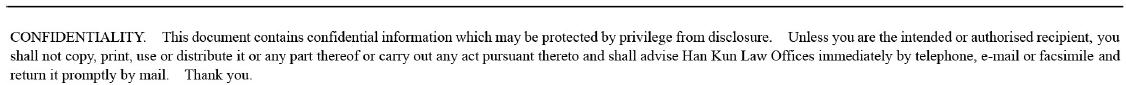 | v. | This opinion is issued based on our understanding of PRC Laws. For matters not explicitly provided under PRC Laws, the interpretation, implementation and application of the specific requirements under PRC Laws, as well as their application to and effect on the legality, binding effect and enforceability of certain contracts, are subject to the final discretion of competent PRC legislative, administrative and judicial authorities. Under PRC Laws, foreign investment is restricted in certain industries. The interpretation and implementation of these laws and regulations, and their application to and effect on the legality, binding effect and enforceability of contracts such as the VIE Agreements and transactions contemplated by the VIE Agreements, are subject to the discretion of the competent Governmental Agency. |