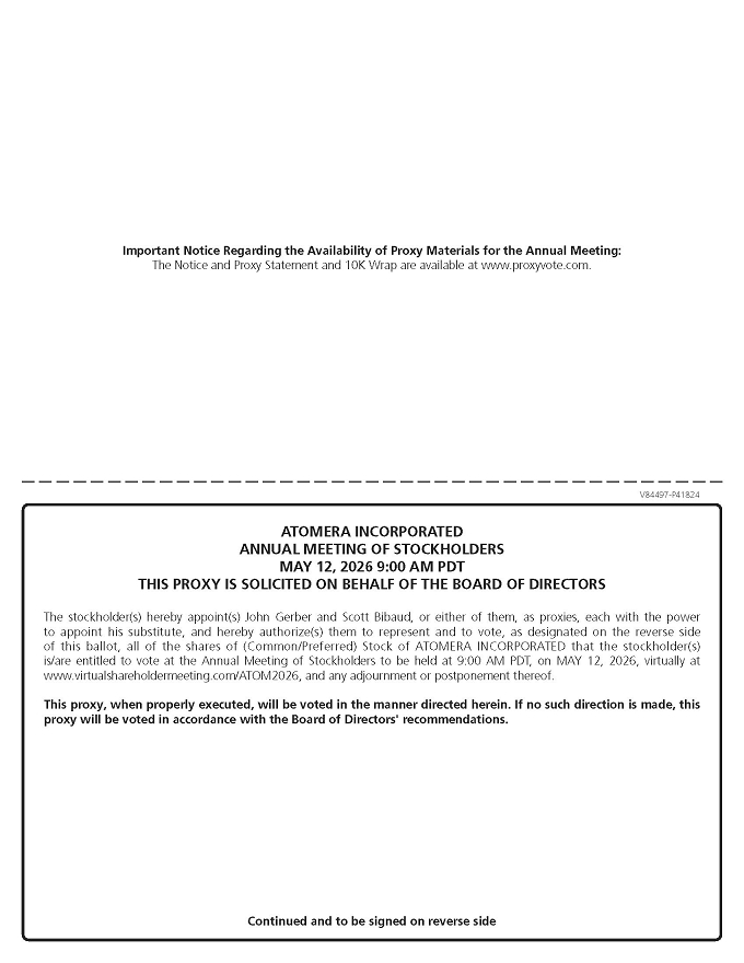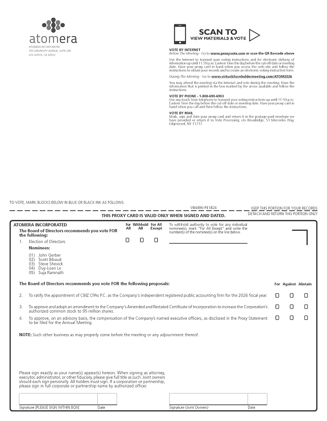 Important Notice Regarding the Availability of Proxy Materials for the Annual Meeting: The Notice and Proxy Statement and 10K Wrap are available at www.proxyvote.com. V84497 - P41824 ATOMERA INCORPORATED ANNUAL MEETING OF STOCKHOLDERS MAY 12, 2026 9:00 AM PDT THIS PROXY IS SOLICITED ON BEHALF OF THE BOARD OF DIRECTORS The stockholder(s) hereby appoint(s) John Gerber and Scott Bibaud, or either of them, as proxies, each with the power to appoint his substitute, and hereby authorize(s) them to represent and to vote, as designated on the reverse side of this ballot, all of the shares of (Common/Preferred) Stock of ATOMERA INCORPORATED that the stockholder(s) is/are entitled to vote at the Annual Meeting of Stockholders to be held at 9 : 00 AM PDT, on MAY 12 , 2026 , virtually at www . virtualshareholdermeeting . com/ATOM 2026 , and any adjournment or postponement thereof . This proxy, when properly executed, will be voted in the manner directed herein . If no such direction is made, this proxy will be voted in accordance with the Board of Directors' recommendations . Continued and to be signed on reverse side