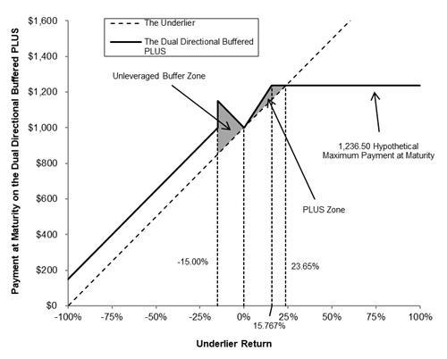 Because $1,000 plus the leveraged upside payment of $750.00 is greater than the maximum payment at maturity, the payment at maturity is equal to the maximum payment at maturity of $1,236.50 per Buffered PLUS, representing a total return of 23.65% on the Buffered PLUS.