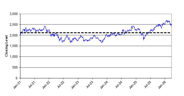 The following graph shows the daily closing levels of the underlier for the period specified below. The closing level of the underlier on March 26, 2026 was 2,493.321. We obtained the closing levels of the underlier from Bloomberg Professional® service, without independent verification. Historical performance of the underlier should not be taken as an indication of future performance. Future performance of the underlier may differ significantly from historical performance, and no assurance can be given as to the closing level of the underlier during the term of the Buffered PLUS, including on the valuation date. We cannot give you assurance that the performance of the underlier will not result in a loss on your initial investment.