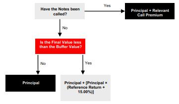 | Your payment on the Notes will depend on whether the Notes have been called, including on the Final Valuation Date, and whether the Final Value is greater than or equal to the Buffer Value. If your Notes are not called, you will lose some or all of your Principal Amount at maturity if the Final Value is less than the Buffer Value. |