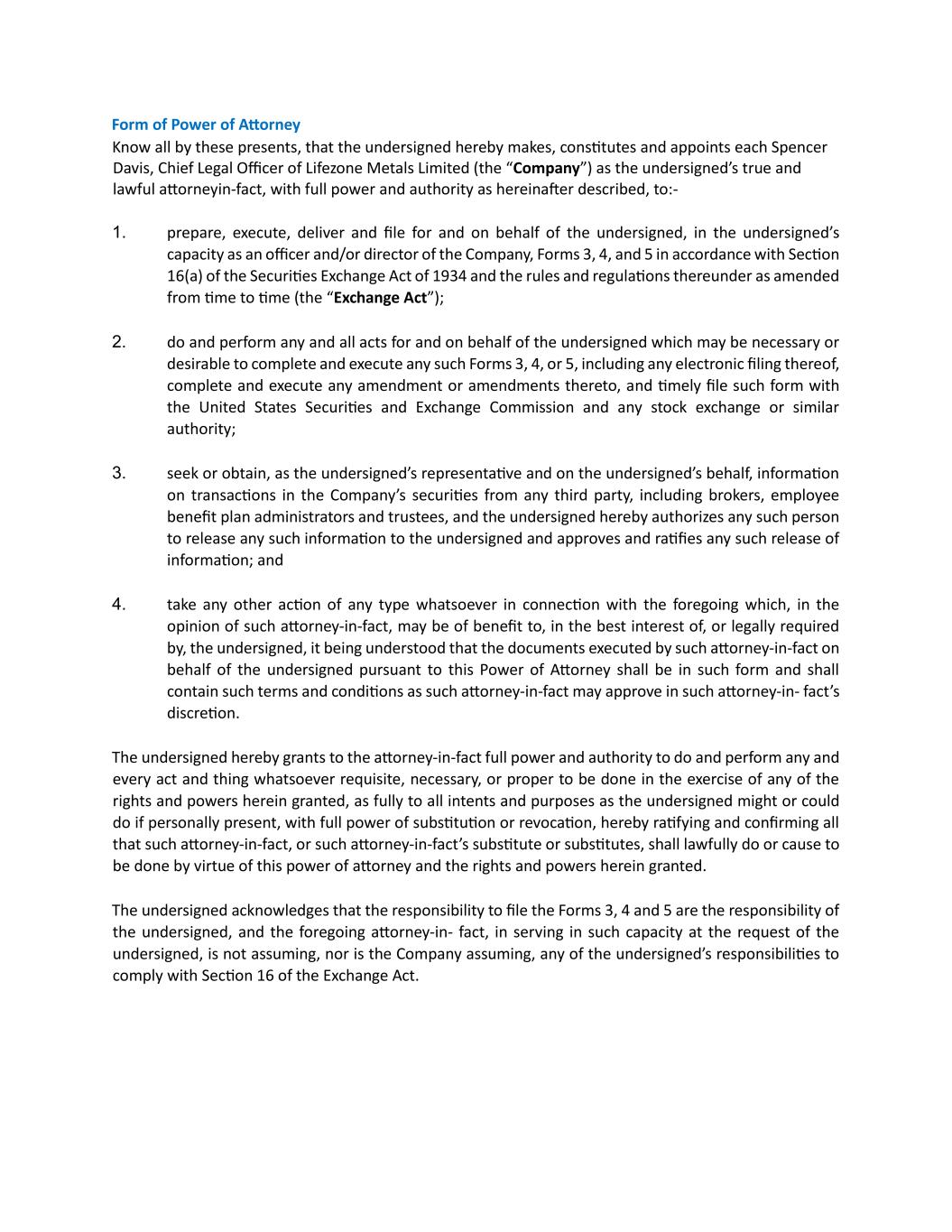 Form of Power of Attorney Know all by these presents, that the undersigned hereby makes, constitutes and appoints each Spencer Davis, Chief Legal Officer of Lifezone Metals Limited (the “Company”) as the undersigned’s true and lawful attorneyin-fact, with full power and authority as hereinafter described, to:- 1. prepare, execute, deliver and file for and on behalf of the undersigned, in the undersigned’s capacity as an officer and/or director of the Company, Forms 3, 4, and 5 in accordance with Section 16(a) of the Securities Exchange Act of 1934 and the rules and regulations thereunder as amended from time to time (the “Exchange Act”); 2. do and perform any and all acts for and on behalf of the undersigned which may be necessary or desirable to complete and execute any such Forms 3, 4, or 5, including any electronic filing thereof, complete and execute any amendment or amendments thereto, and timely file such form with the United States Securities and Exchange Commission and any stock exchange or similar authority; 3. seek or obtain, as the undersigned’s representative and on the undersigned’s behalf, information on transactions in the Company’s securities from any third party, including brokers, employee benefit plan administrators and trustees, and the undersigned hereby authorizes any such person to release any such information to the undersigned and approves and ratifies any such release of information; and 4. take any other action of any type whatsoever in connection with the foregoing which, in the opinion of such attorney-in-fact, may be of benefit to, in the best interest of, or legally required by, the undersigned, it being understood that the documents executed by such attorney-in-fact on behalf of the undersigned pursuant to this Power of Attorney shall be in such form and shall contain such terms and conditions as such attorney-in-fact may approve in such attorney-in- fact’s discretion. The undersigned hereby grants to the attorney-in-fact full power and authority to do and perform any and every act and thing whatsoever requisite, necessary, or proper to be done in the exercise of any of the rights and powers herein granted, as fully to all intents and purposes as the undersigned might or could do if personally present, with full power of substitution or revocation, hereby ratifying and confirming all that such attorney-in-fact, or such attorney-in-fact’s substitute or substitutes, shall lawfully do or cause to be done by virtue of this power of attorney and the rights and powers herein granted. The undersigned acknowledges that the responsibility to file the Forms 3, 4 and 5 are the responsibility of the undersigned, and the foregoing attorney-in- fact, in serving in such capacity at the request of the undersigned, is not assuming, nor is the Company assuming, any of the undersigned’s responsibilities to comply with Section 16 of the Exchange Act.