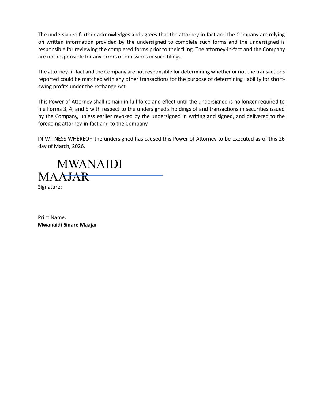 The undersigned further acknowledges and agrees that the attorney-in-fact and the Company are relying on written information provided by the undersigned to complete such forms and the undersigned is responsible for reviewing the completed forms prior to their filing. The attorney-in-fact and the Company are not responsible for any errors or omissions in such filings. The attorney-in-fact and the Company are not responsible for determining whether or not the transactions reported could be matched with any other transactions for the purpose of determining liability for short- swing profits under the Exchange Act. This Power of Attorney shall remain in full force and effect until the undersigned is no longer required to file Forms 3, 4, and 5 with respect to the undersigned’s holdings of and transactions in securities issued by the Company, unless earlier revoked by the undersigned in writing and signed, and delivered to the foregoing attorney-in-fact and to the Company. IN WITNESS WHEREOF, the undersigned has caused this Power of Attorney to be executed as of this 26 day of March, 2026. MWANAIDI MAAJAR Signature: Print Name: Mwanaidi Sinare Maajar