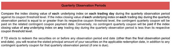 “issuer call”), on the contingent coupon payment date corresponding to such observation period end-date (the “redemption date”), regardless of the index closing values of the underlying indices on such observation period end-date. If TD