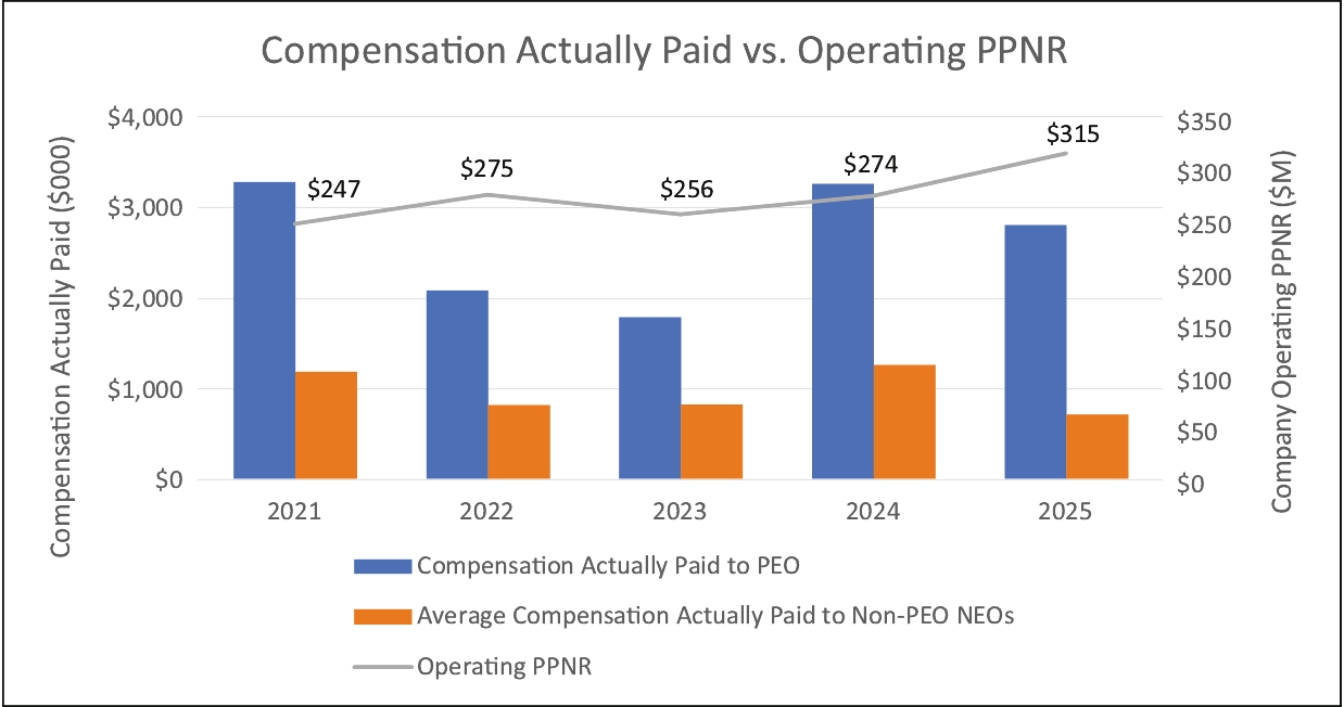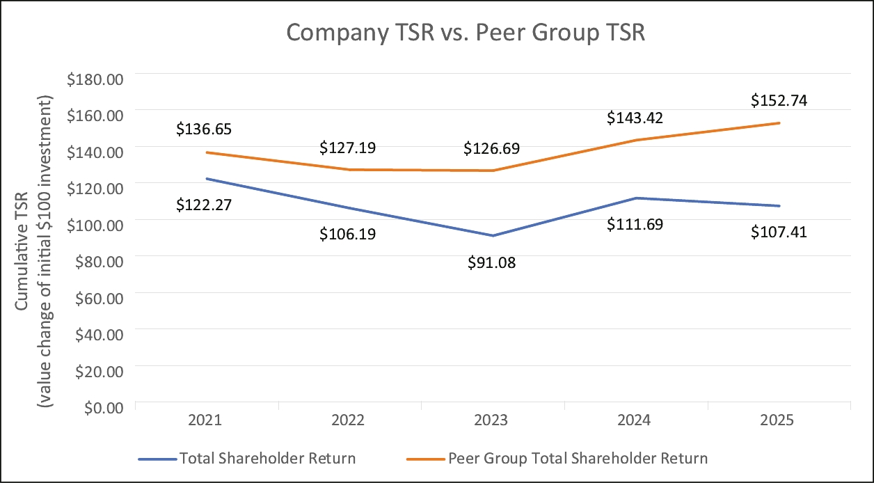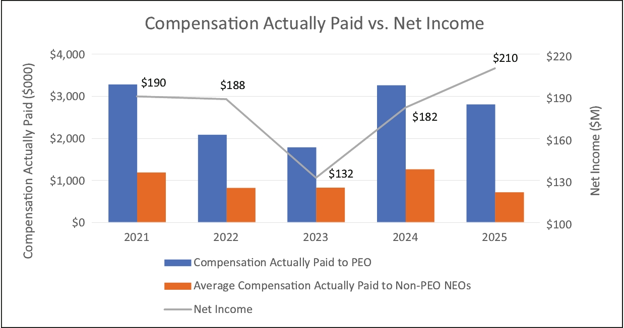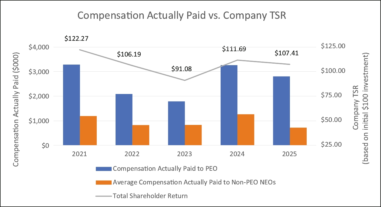 PAY VERSUS PERFORMANCE As required by Section 953(a) of the Dodd-Frank Wall Street Reform and Consumer Protection Act (“Dodd-Frank Act”), and Item 402(v) of Regulation S-K, the Company is providing the following information about the relationship between executive “compensation actually paid” (as computed in accordance with Item 402(v)) and certain financial performance of the Company. The Compensation Committee did not consider this Pay versus Performance disclosure in making its pay decisions for any of the years shown. For further information concerning the Company’s variable pay-for-performance philosophy and how the Company aligns executive compensation with the Company’s performance, refer to “Compensation Discussion and Analysis- Our Compensation Philosophy.” Pay Versus Performance Table | | | | | | | | | | | | | | | | | | | | | | | | | (a) | | | (b) | | | (c) | | | (d) | | | (e) | | | (f) | | | (g) | | | (h) | | | (i) | | | 2025 | | | $2,793,781 | | | $2,795,886 | | | $1,089,023 | | | $707,115 | | | $107.41 | | | $152.74 | | | $210,455 | | | $315,327 | | | 2024 | | | $2,700,891 | | | $3,251,228 | | | $1,050,298 | | | $1,252,084 | | | $111.69 | | | $143.42 | | | $182,481 | | | $273,588 | | | 2023 | | | $2,517,123 | | | $1,778,133 | | | $1,037,853 | | | $818,007 | | | $91.08 | | | $126.69 | | | $131,924 | | | $256,385 | | | 2022 | | | $349,619 | | | $2,077,067 | | | $793,121 | | | $811,479 | | | $106.19 | | | $127.19 | | | $188,081 | | | $275,066 | | | 2021 | | | $3,154,969 | | | $3,271,781 | | | $1,195,097 | | | $1,177,734 | | | $122.27 | | | $136.65 | | | $189,694 | | | $247,344 | | | | | | | | | | | | | | | | | | | | | | | | | | | | |