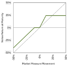 This graph reflects the returns on the notes, based on the Participation Rate of 200%, the Threshold Value of 90% of the Starting Value and a hypothetical Capped Value of $12.40 per unit (the midpoint of the Capped Value range of [$12.20 to $12.60]). The green line reflects the returns on the notes, while the dotted gray line reflects the returns of a direct investment in the stocks included in the Index, excluding dividends.