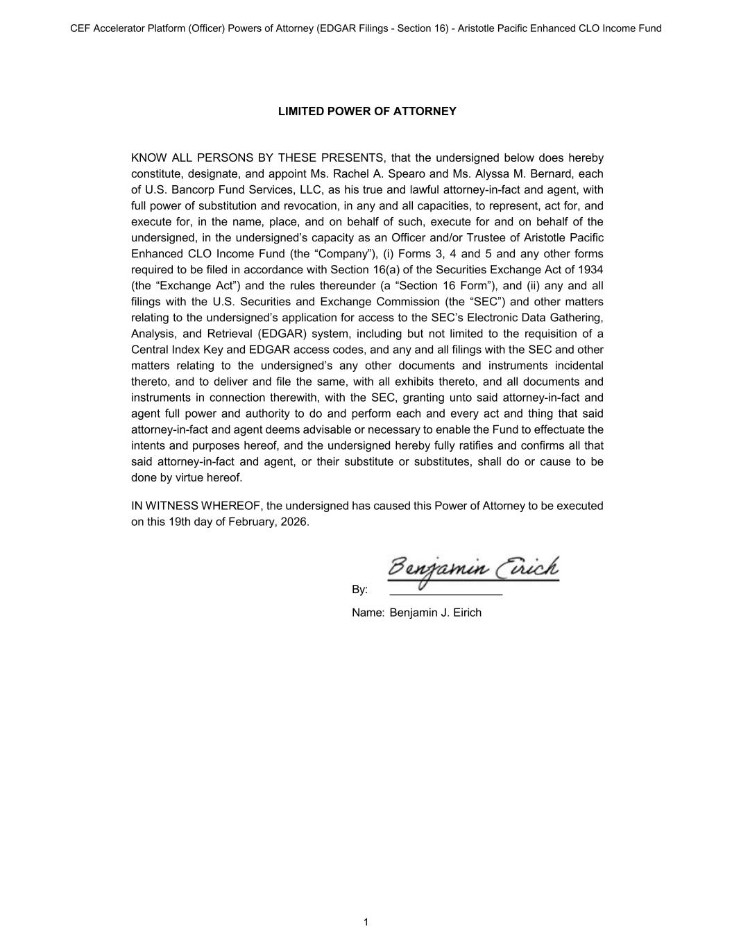 LIMITED POWER OF ATTORNEY KNOW ALL PERSONS BY THESE PRESENTS, that the undersigned below does hereby constitute, designate, and appoint Ms. Rachel A. Spearo and Ms. Alyssa M. Bernard, each of U.S. Bancorp Fund Services, LLC, as his true and lawful attorney-in-fact and agent, with full power of substitution and revocation, in any and all capacities, to represent, act for, and execute for, in the name, place, and on behalf of such, execute for and on behalf of the undersigned, in the undersigned’s capacity as an Officer and/or Trustee of Aristotle Pacific Enhanced CLO Income Fund (the “Company”), (i) Forms 3, 4 and 5 and any other forms required to be filed in accordance with Section 16(a) of the Securities Exchange Act of 1934 (the “Exchange Act”) and the rules thereunder (a “Section 16 Form”), and (ii) any and all filings with the U.S. Securities and Exchange Commission (the “SEC”) and other matters relating to the undersigned’s application for access to the SEC’s Electronic Data Gathering, Analysis, and Retrieval (EDGAR) system, including but not limited to the requisition of a Central Index Key and EDGAR access codes, and any and all filings with the SEC and other matters relating to the undersigned’s any other documents and instruments incidental thereto, and to deliver and file the same, with all exhibits thereto, and all documents and instruments in connection therewith, with the SEC, granting unto said attorney-in-fact and agent full power and authority to do and perform each and every act and thing that said attorney-in-fact and agent deems advisable or necessary to enable the Fund to effectuate the intents and purposes hereof, and the undersigned hereby fully ratifies and confirms all that said attorney-in-fact and agent, or their substitute or substitutes, shall do or cause to be done by virtue hereof. IN WITNESS WHEREOF, the undersigned has caused this Power of Attorney to be executed on this 19th day of February, 2026. By: Name: Benjamin J. Eirich CEF Accelerator Platform (Officer) Powers of Attorney (EDGAR Filings - Section 16) - Aristotle Pacific Enhanced CLO Income Fund 1