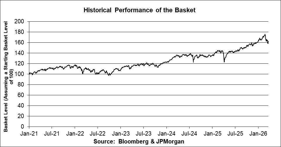 The following graph is based on the basket closing levels for the period from January 4, 2021 through March 25, 2026, assuming that the basket closing level was 100 on January 4, 2021. We derived the basket closing levels based on the method of calculating the basket closing level as described in this pricing supplement and on the closing levels of the relevant basket underliers on the relevant dates. We obtained the closing levels reflected in the graph below from the Bloomberg Professional® service