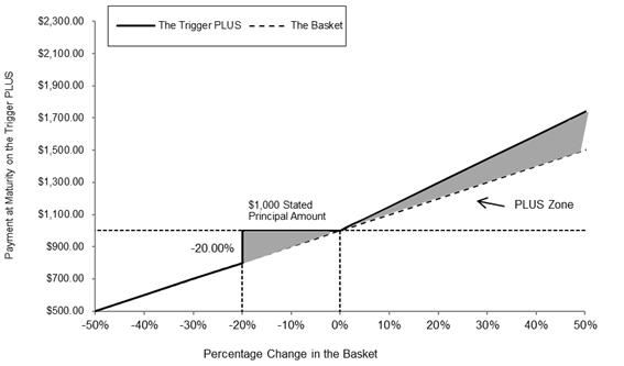 | Downside Scenario | The final basket value is less than the trigger level. In this case, the Trigger PLUS pay an amount that is over 20% less than the stated principal amount and this decrease will be by an amount that is proportionate to the percentage decline of the final basket value from the initial basket value. (Example: if the basket decreases in value by 40%, the Trigger PLUS will pay an amount that is less than the stated principal amount by 40%, or $600 per Trigger PLUS.) |