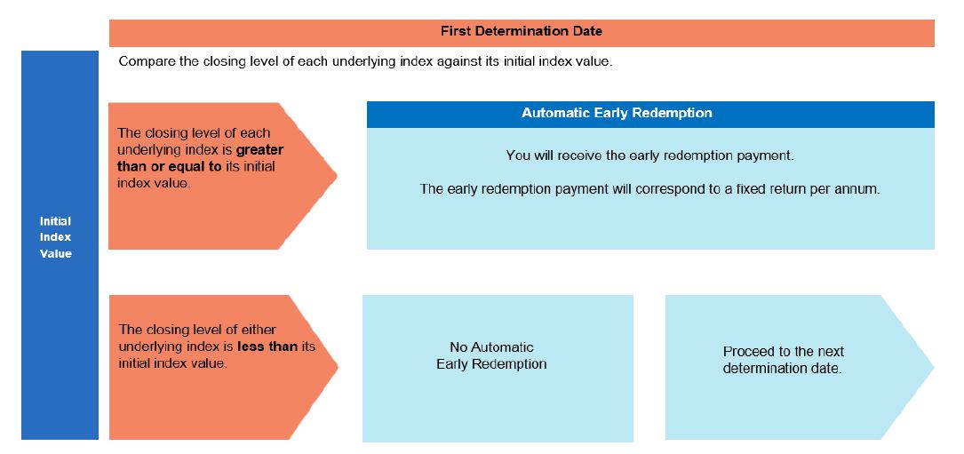 | Automatic early redemption: | If, on the first determination date, the closing level of each underlying index is greater than or equal to its initial index value, the securities will be automatically redeemed for a cash payment equal to the early redemption payment payable on the redemption date. | ||||