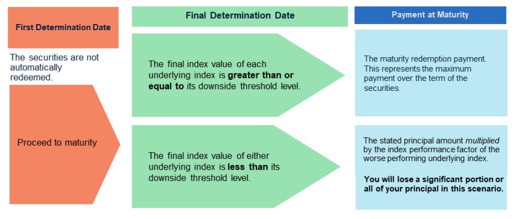 | · If the final index value of each underlying index is greater than or equal to its downside threshold level: | the maturity redemption payment, which is an amount in cash per stated principal amount corresponding to a return of at least approximately 8.25% per annum, or at least $1,165.00. The actual maturity redemption payment will be provided in the pricing supplement. | ||||