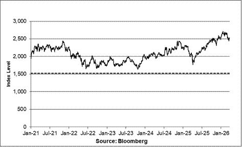 The following table sets forth the published high and low closing levels, as well as end-of-quarter closing levels, of the S&P 500® Index for each quarter in the period from January 1, 2021 through March 25, 2026. The closing level of the S&P 500® Index on March 25, 2026 was 6,591.90. The associated graph shows the closing levels of the S&P 500® Index for each day in the same period. We obtained the closing level information above and in the table and graph below from Bloomberg, without independent verification.