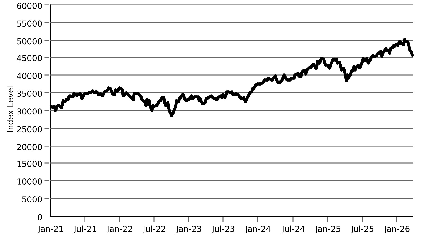 The following graphs set forth the historical performance of each Index based on the weekly historical closing levels from January 8, 2021 through March 20, 2026. The closing level of the Dow Jones Industrial Average® on March 26, 2026 was 45,960.11. The closing level of the Russell 2000® Index on March 26, 2026 was 2,493.321. The closing level of the S&P 500® Index on March 26, 2026 was 6,477.16. We obtained the closing levels above and below from the Bloomberg Professional® service (“Bloomberg”), without independent verification.