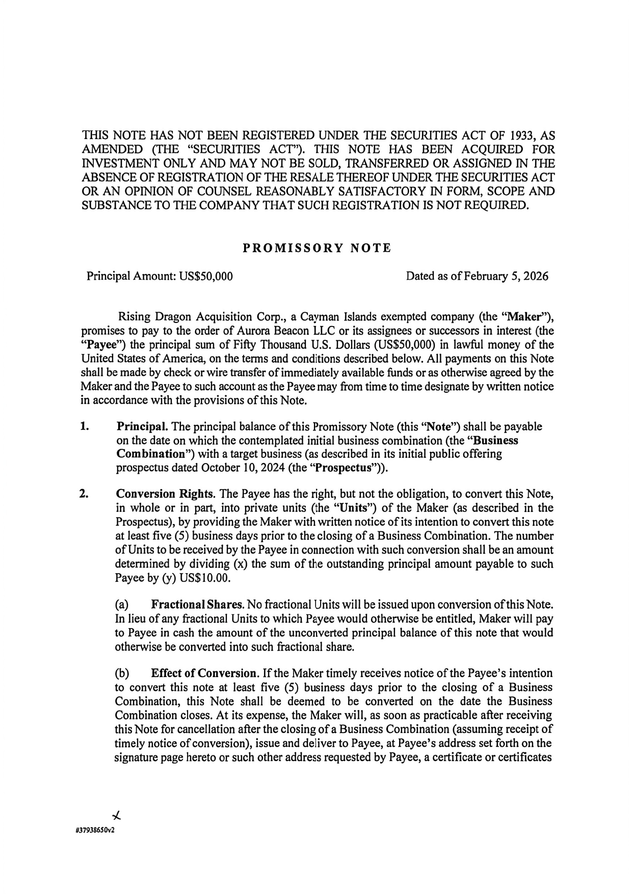 THIS NOTE HAS NOT BEEN REGISTERED UNDER THE SECURITIES ACT OF 1933 , AS AMENDED (THE “SECURITIES ACT”) . THIS NOTE HAS BEEN ACQUIRED FOR INVESTMENT ONLY AND MAY NOT BE SOLD, TRANSFERRED OR ASSIGNED IN THE ABSENCE OF REGISTRATION OF THE RESALE THEREOF UNDER THE SECURITIES ACT OR AN OPINION OF COUNSEL REASONABLY SATISFACTORY IN FORM, SCOPE AND SUBSTANCE TO THE COMPANY THAT SUCH REGISTRATION IS NOT REQUIRED . PR O M I S S OR Y NOT E Principal Amount: US$50,000 Dated as of February 5, 2026 Rising Dragon Acquisition Corp . , a Cayman Islands exempted company (the “Maker”), promises to pay to the order of Aurora Beacon LLC or its assignees or successors in interest (the “Payee”) the principal sum of Fifty Thousand U . S . Dollars (US $ 50 , 000 ) in lawful money of the United States of America, on the terms and conditions described below . All payments on this Note shall be made by check or wire transfer of immediately available funds or as otherwise agreed by the Maker and the Payee to such account as the Payee may from time to time designate by written notice in accordance with the provisions of this Note . Principal. The principal balance of this Promissory Note (this “Note”) shall be payable on the date on which the contemplated initial business combination (the “Business Combination”) with a target business (as described in its initial public offering prospectus dated October 10, 2024 (the “Prospectus”)). s37938630v2 2. Conversion Rights . The Payee has the right, but not the obligation, to convert this Note, in whole or in part, into private units (the “Units”) of the Maker (as described in the Prospectus), by providing the Maker with written notice of its intention to convert this note at least five ( 5 ) business days prior to the closing of a Business Combination . The number of Units to be received by the Payee in connection with such conversion shall be an amount determined by dividing (x) the sum of the outstanding principal amount payable to such Payee by (y) US $ 10 . 00 . (a) Fractional Shares . No fractional Units will be issued upon conversion of this Note . In lieu of any fractional Units to which Payee would otherwise be entitled, Maker will pay to Payee in cash the amount of the unconverted principal balance of this note that would otherwise be converted into such fractional share . (b) Effect of Conversion . If the Maker timely receives notice of the Payee's intention to convert this note at least five ( 5 ) business days prior to the closing of a Business Combination, this Note shall be deemed to be converted on the date the Business Combination closes . At its expense, the Maker will, as soon as practicable after receiving this Note for cancellation after the closing of a Business Combination (assuming receipt of timely notice of conversion), issue and deliver to Payee, at Payee's address set forth on the signature page hereto or such other address requested by Payee, a certificate or certificates
