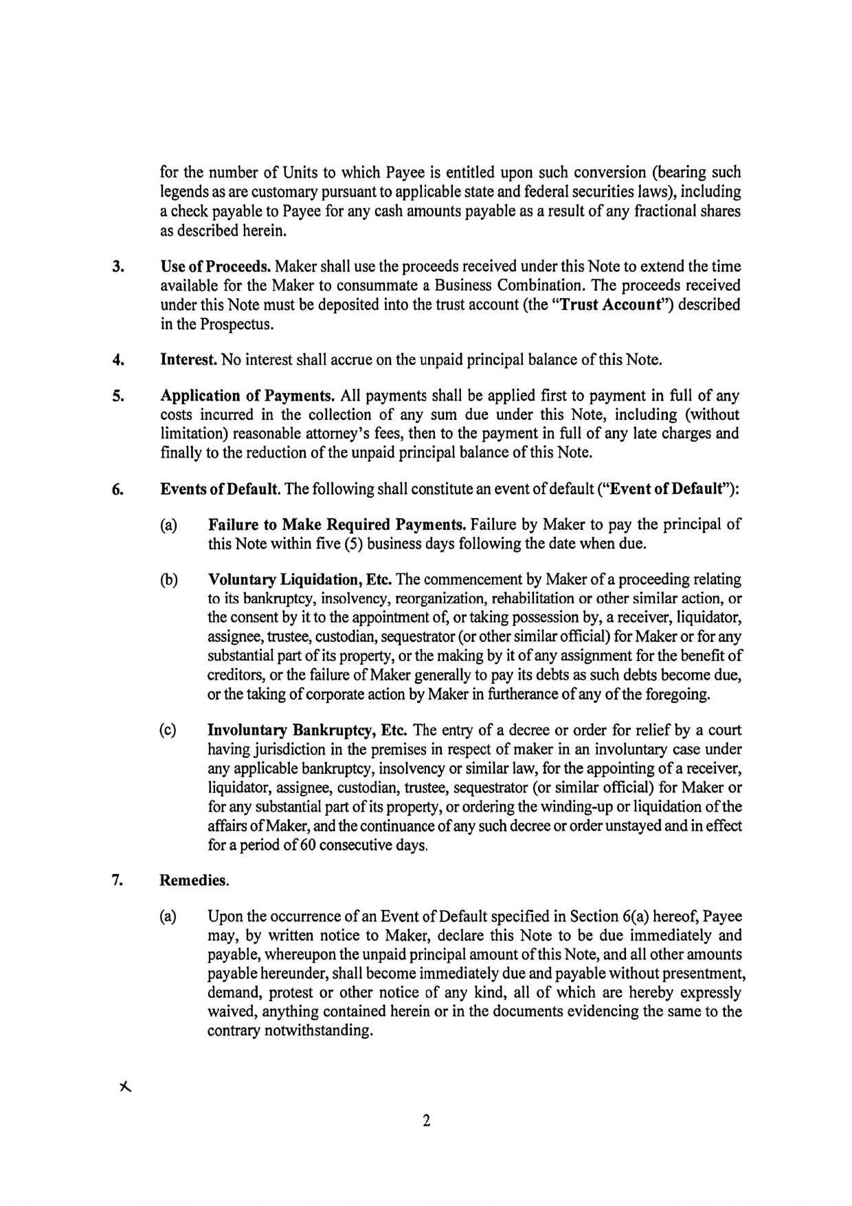 for the number of Units to which Payee is entitled upon such conversion (bearing such legends as are customary pursuant to applicable state and federal Securities laws), including a check payable to Payee for any cash amounts payable as a result of any fractional shares as described herein . Use of Proceeds . Maker shall use the proceeds received under this Note to extend the time available for the Maker to consummate a Business Combination . The proceeds received under this Note must be deposited into the tnist account (the “Trust Account”) described in the Prospectus . Interest . No interest shall accrue on the unpaid principal balance of this Note . Application of Payments . All payments shall be applied first to payment in full of any costs incurred in the collection of any sum due under this Note, including (without limitation) reasonable attorney's fees, then to the payment in full of any late charges and finally to the reduction of the unpaid principal balance of this Note . 3. 4. 5. 6. Events of Default. The following shall constitute an event of default(“Event of Default”): (a) Failure to Make Required Payments . Failure by Maker to pay the principal of this Note within five ( 5 ) business days following the date when due . (b) Voluntary Liquidation, Etc . The commencement by Maker of a proceeding relating to its bankruptcy, insolvency, reorganization, rehabilitation or other similar action, or the consent by it to the appointment of, or taking possession by, a receiver, liquidator, assignee, trustee, custodian, sequestrator(or other similar official) for Maker or for any substantial part of its property, or the making by it of any assignment for the benefit of creditors, or the failure of Maker generally to pay its debts as such debts become due, or the taking of corporate action by Maker in furtherance of any of the foregoing . (c) Involuntary Bankruptcy, Etc . The entry of a decree or order for relief by a court having jurisdiction in the premises in respect of maker in an involuntary case under any applicable bankruptcy, insolvency or similar law, for the appointing of a receiver, liquidator, assignee, custodian, trustee, sequestrator (or similar official) for Maker or for any substantial part of its property, or ordering the winding - up or liquidation of the affairs of Maker, and the continuance of any such decree or order unstayed and in effect for a period of 60 consecutive days . 7. Remedies. (a) Upon the occurrence of an Event of Default specified in Section 6 (a) hereof, Payee may, by written notice to Maker, declare this Note to be due immediately and payable, whereupon the unpaid principal amount of this Note, and all other amounts payable hereunder, shall become immediately due and payable without presentment, demand, protest or other notice of any kind, all of which are hereby expressly waived, anything contained herein or in the documents evidencing the same to the contrary notwithstanding . 2