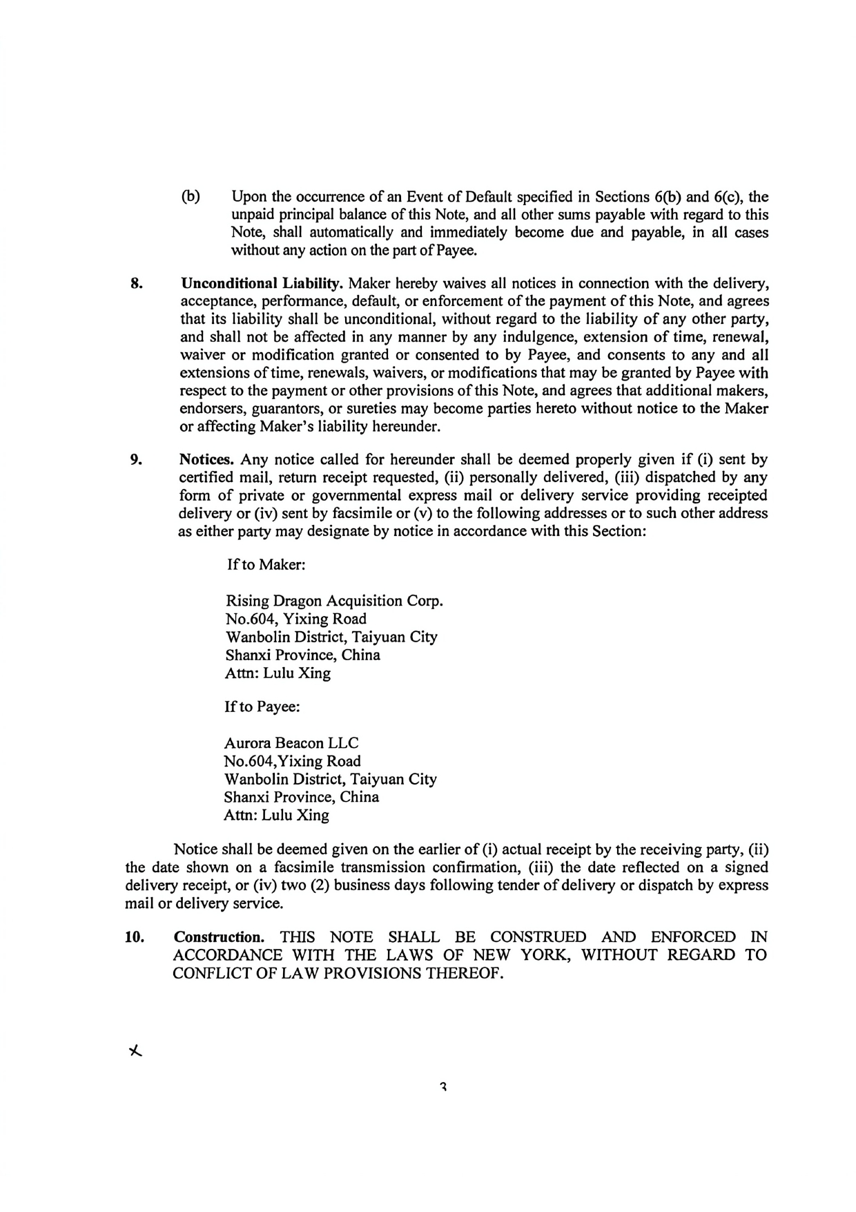 (b) Upon the occurrence of an Event of Default specified in Sections 6 (b) and 6 (c), the unpaid principal balance of this Note, and all other sums payable with regard to this Note, shall automatically and immediately become due and payable, in all cases without any action on the part of Payee . 8. Unconditional Liability . Maker hereby waives all notices in connection with the delivery, acceptance, performance, default, or enforcement of the payment of this Note, and agrees that its liability shall be unconditional, without regard to the liability of any other party, and shall not be affected in any manner by any indulgence, extension of time, renewal, waiver or modification granted or consented to by Payee, and consents to any and all extensions of time, renewals, waivers, or modifications that may be granted by Payee with respect to the payment or other provisions of this Note, and agrees that additional makers, endorsers, guarantors, or sureties may become parties hereto without notice to the Maker or affecting Maker's liability hereunder . Notices . Any notice called for hereunder shall be deemed properly given if (i) sent by certified mail, return receipt requested, (ii) personally delivered, (iii) dispatched by any form of private or governmental express mail or delivery service providing receipted delivery or (iv) sent by facsimile or (v) to the following addresses or to such other address as either party may designate by notice in accordance with this Section : If to Maker: 9. Rising Dragon Acquisition Corp. No.604, Yixing Road Wanbolin District, Taiyuan City Shanxi Province, China Attn: Lulu Xing If to Payee: Aurora Beacon LLC No.604,Yixing Road Wanbolin District, Taiyuan City Shanxi Province, China Attn: Lulu Xing Notice shall be deemed given on the earlier of(i) actual receipt by the receiving party, (ii) the date shown on a facsimile transmission confirmation, (iii) the date reflected on a signed delivery receipt, or (iv) two ( 2 ) business days following tender of delivery or dispatch by express mail or delivery service . 10 . Construction . THIS NOTE SHALL BE CONSTRUED AND ENFORCED IN ACCORDANCE WITH THE LAWS OF NEW YORK, WITHOUT REGARD TO CONFLICT OF LAW PROVISIONS THEREOF .