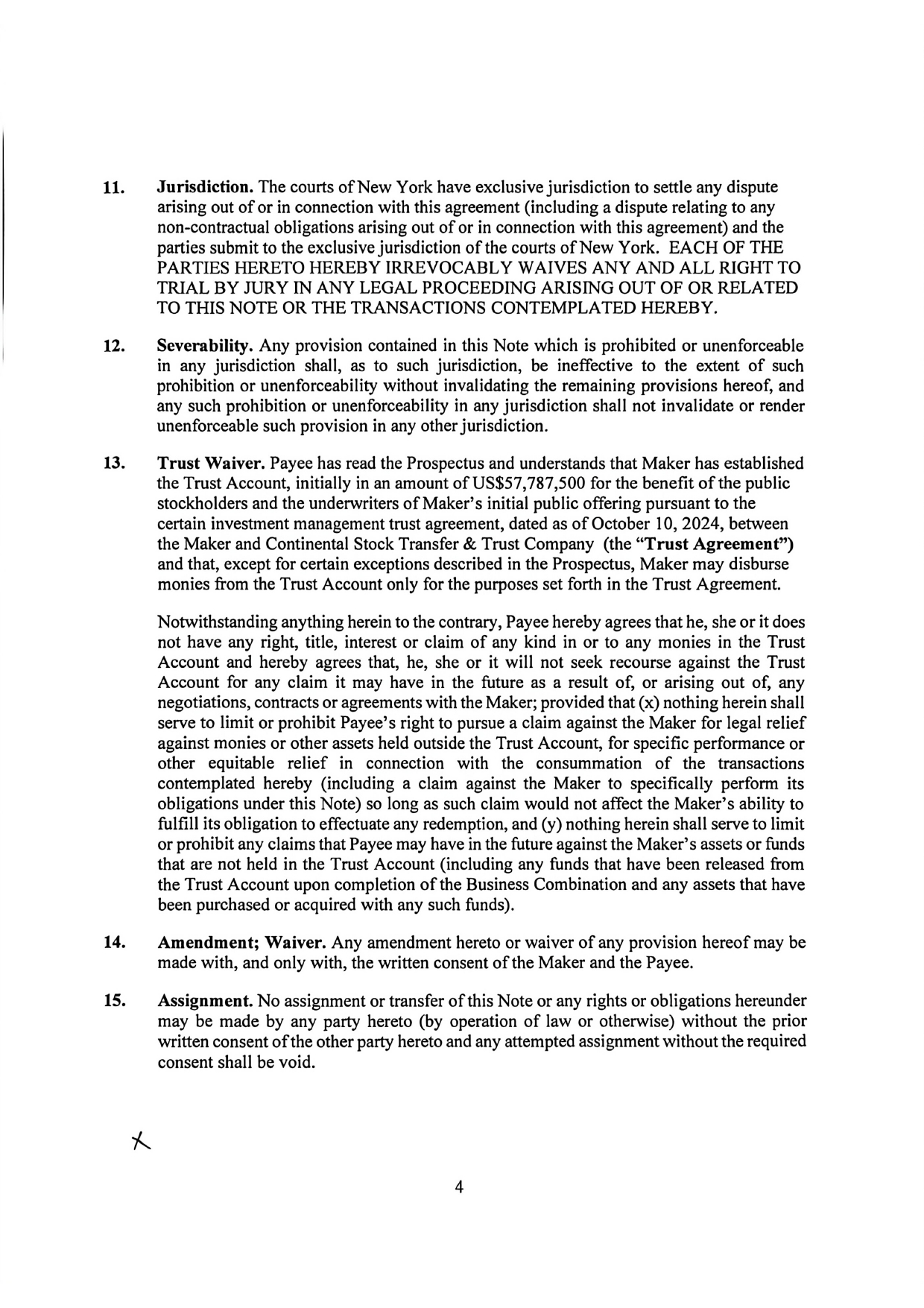 4 11. 12. Jurisdiction. The courts of New York have exclusive jurisdiction to settle any dispute arising out of or in connection with this agreement (including a dispute relating to any non - contractual obligations arising out of or in connection with this agreement) and the parties submit to the exclusive jurisdiction of the courts of New York. EACH OF THE PARTIES HERETO HEREBY IRREVOCABLY WAIVES ANY AND ALL RIGHT TO TRIAL BY JURY IN ANY LEGAL PROCEEDING ARISING OUT OF OR RELATED TO THIS NOTE OR THE TRANSACTIONS CONTEMPLATED HEREBY. Severability . Any provision contained in this Note which is prohibited or unenforceable in any jurisdiction shall, as to such jurisdiction, be ineffective to the extent of such prohibition or unenforceability without invalidating the remaining provisions hereof, and any such prohibition or unenforceability in any jurisdiction shall not invalidate or render unenforceable such provision in any other jurisdiction . 13. Trust Waiver. Payee has read the Prospectus and understands that Maker has established the Trust Account, initially in an amount of US$57,787,500 for the benefit of the public stockholders and the underwriters of Maker's initial public offering pursuant to the certain investment management trust agreement, dated as of October 10, 2024, between the Maker and Continental Stock Transfer & Trust Company (the “Trust Agreement") and that, except for certain exceptions described in the Prospectus, Maker may disburse monies from the Trust Account only for the purposes set forth in the Trust Agreement. Notwithstanding anything herein to the contrary, Payee hereby agrees that he, she or it does not have any right, title, interest or claim of any kind in or to any monies in the Trust Account and hereby agrees that, he, she or it will not seek recourse against the Trust Account for any claim it may have in the future as a result of, or arising out of, any negotiations, contracts or agreements with the Maker ; provided that (x) nothing herein shall serve to limit or prohibit Payee's right to pursue a claim against the Maker for legal relief against monies or other assets held outside the Trust Account, for specific performance or other equitable relief in connection with the consummation of the transactions contemplated hereby (including a claim against the Maker to specifically perform its obligations under this Note) so long as such claim would not affect the Maker's ability to fulfill its obligation to effectuate any redemption, and (y) nothing herein shall serve to limit or prohibit any claims that Payee may have in the future against the Maker's assets or funds that are not held in the Trust Account (including any funds that have been released from the Trust Account upon completion of the Business Combination and any assets that have been purchased or acquired with any such funds) . 14. Amendment; Waiver. Any amendment hereto or waiver of any provision hereof may be made with, and only with, the written consent of the Maker and the Payee. 15. Assignment . No assignment or transfer of this Note or any rights or obligations hereunder may be made by any party hereto (by operation of law or otherwise) without the prior written consent of the other party hereto and any attempted assignment without the required consent shall be void .