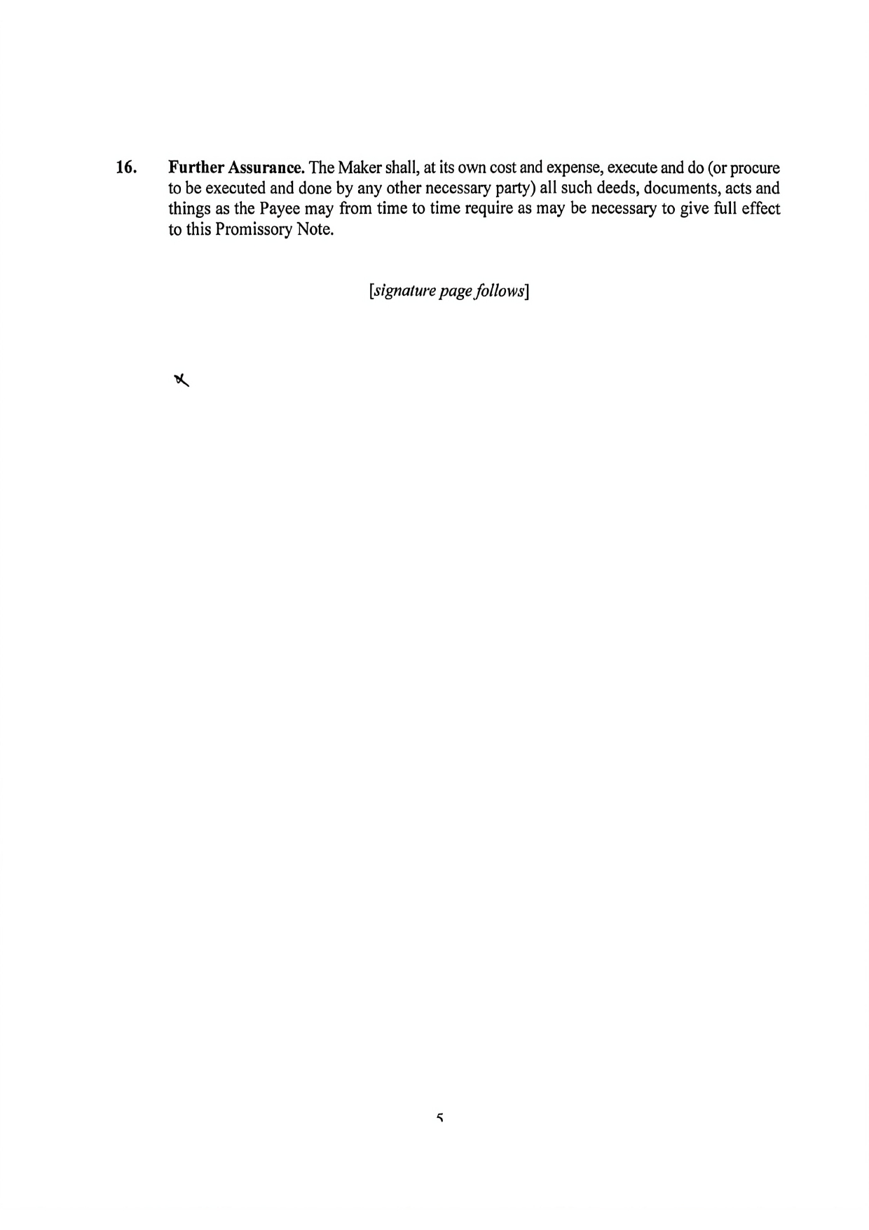 16 . Further Assurance . The Maker shall, at its own cost and expense, execute and do (or procure to be executed and done by any other necessary party) all such deeds, documents, acts and things as the Payee may from time to time require as may be necessary to give full effect to this Promissory Note . signals e page follows)
