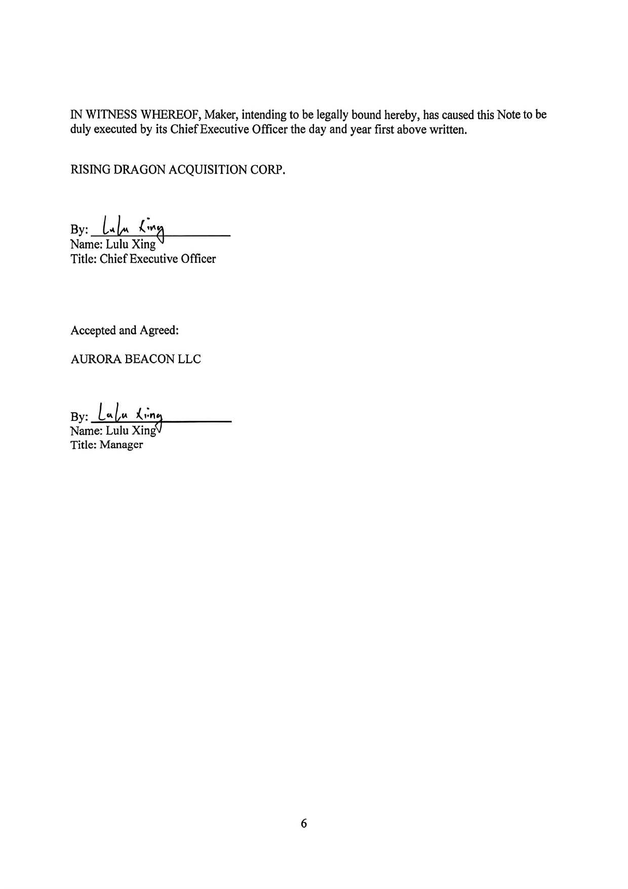IN WITNESS WHEREOF, Maker, intending to be legally bound hereby, has caused this Note to be duly executed by its Chief Executive Officer the day and year first above written. RISING DRAGON ACQUISITION CORP. 6 By: $• /^ Name: Lulu Xing Title: Chief Executive Officer Accepted and Agreed: AURORA BEACON LLC By: ^ Name: Lulu Xing Title: Manager